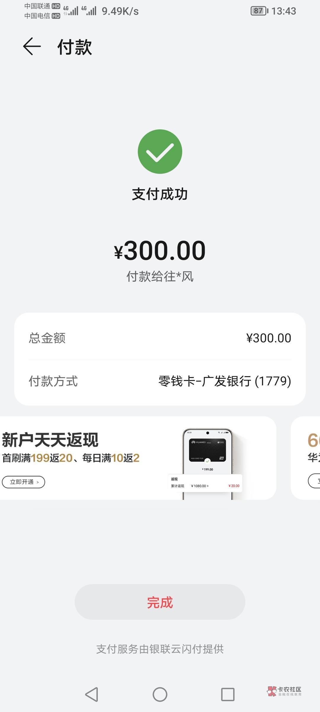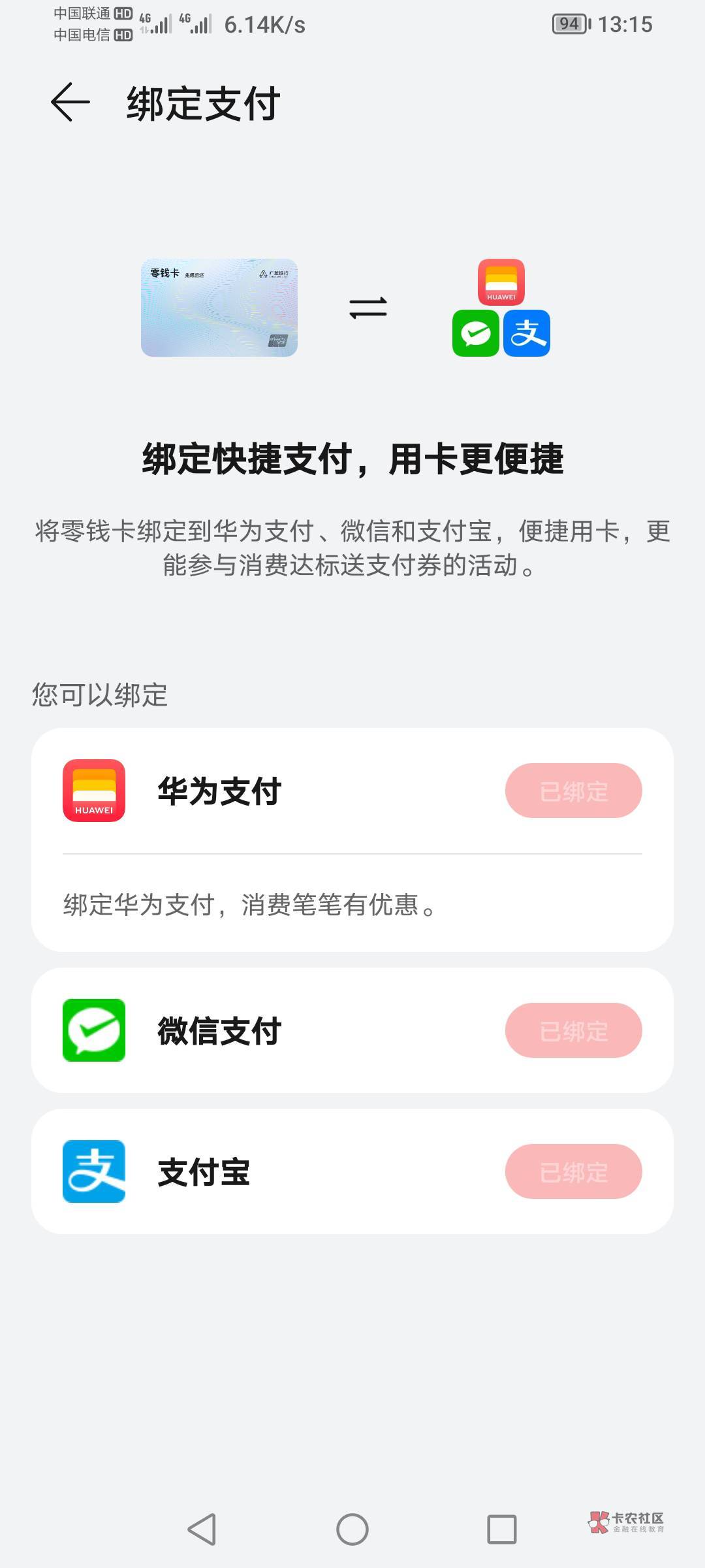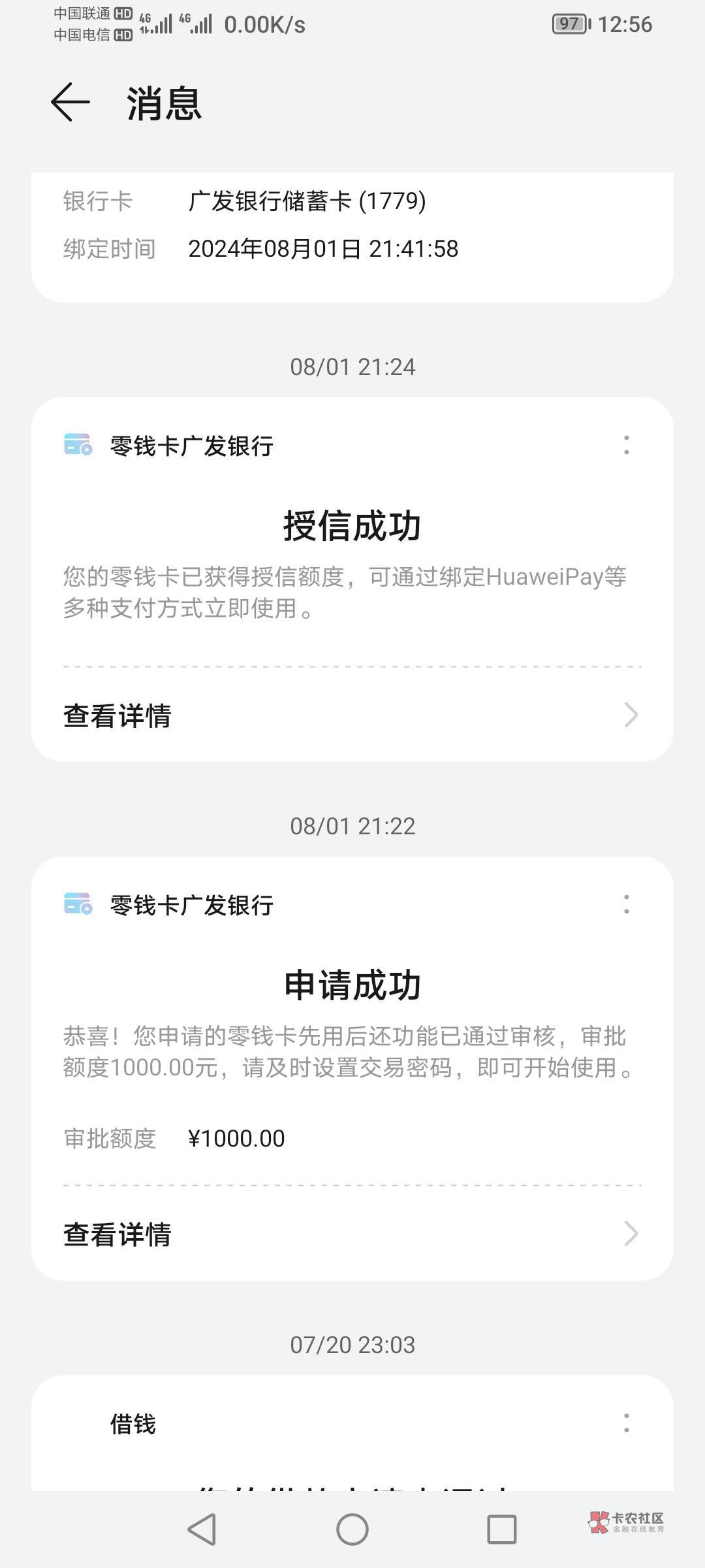 【广发银行】您申请的华为钱包零钱卡(先用后还)业务,已于2024年08月02日审批通过,可用额度1500.00元。您可前往【华为钱包-零钱卡-卡片管理-关联第三方支付渠道】将卡片绑定至微信、支付宝等渠道消费使用。需不需要激活开通?