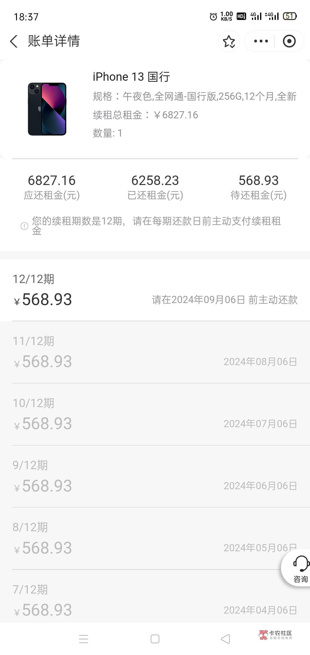 这就是续租的,总共一万三吧。有当逾,爱租机两台,择机汇三台,还完三台了!