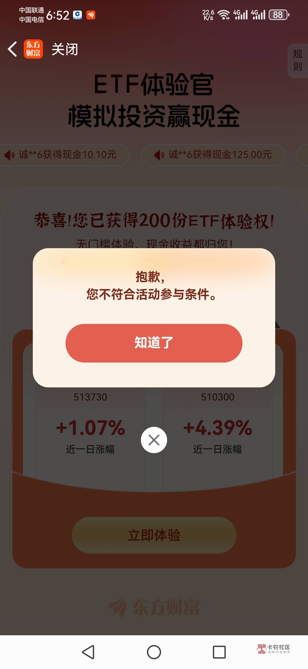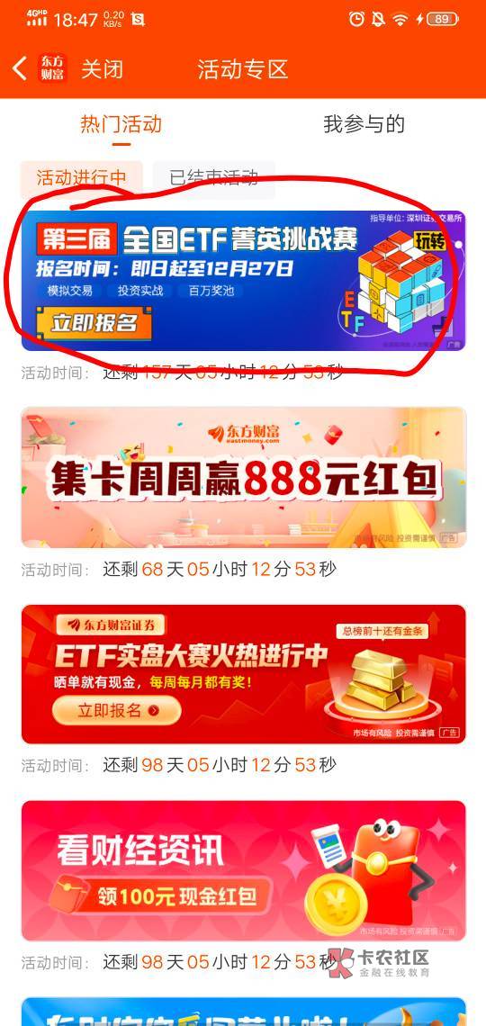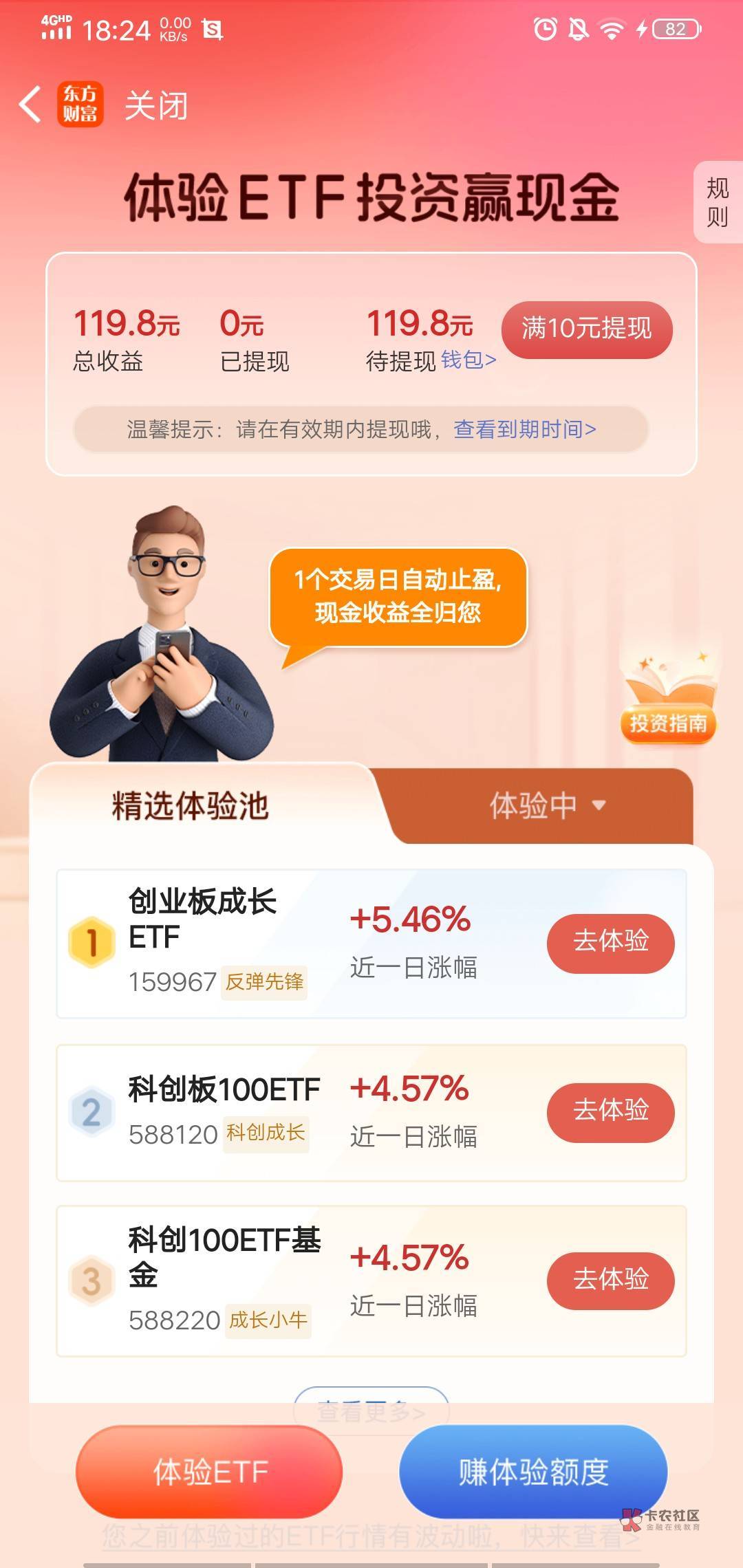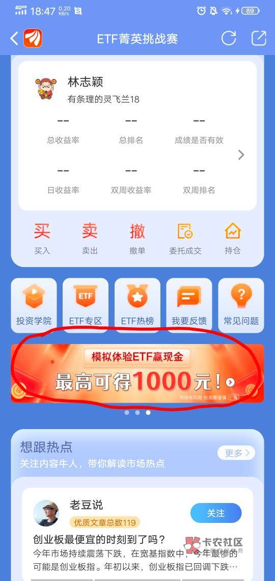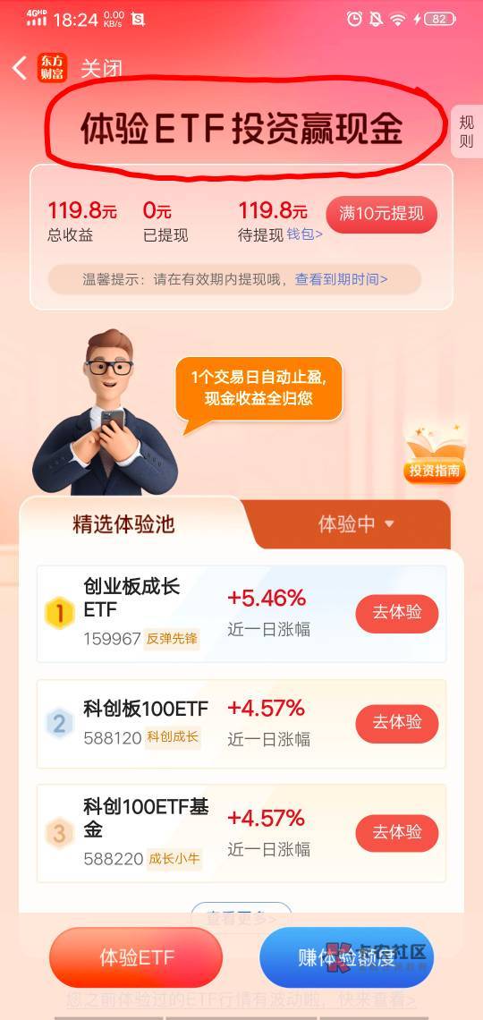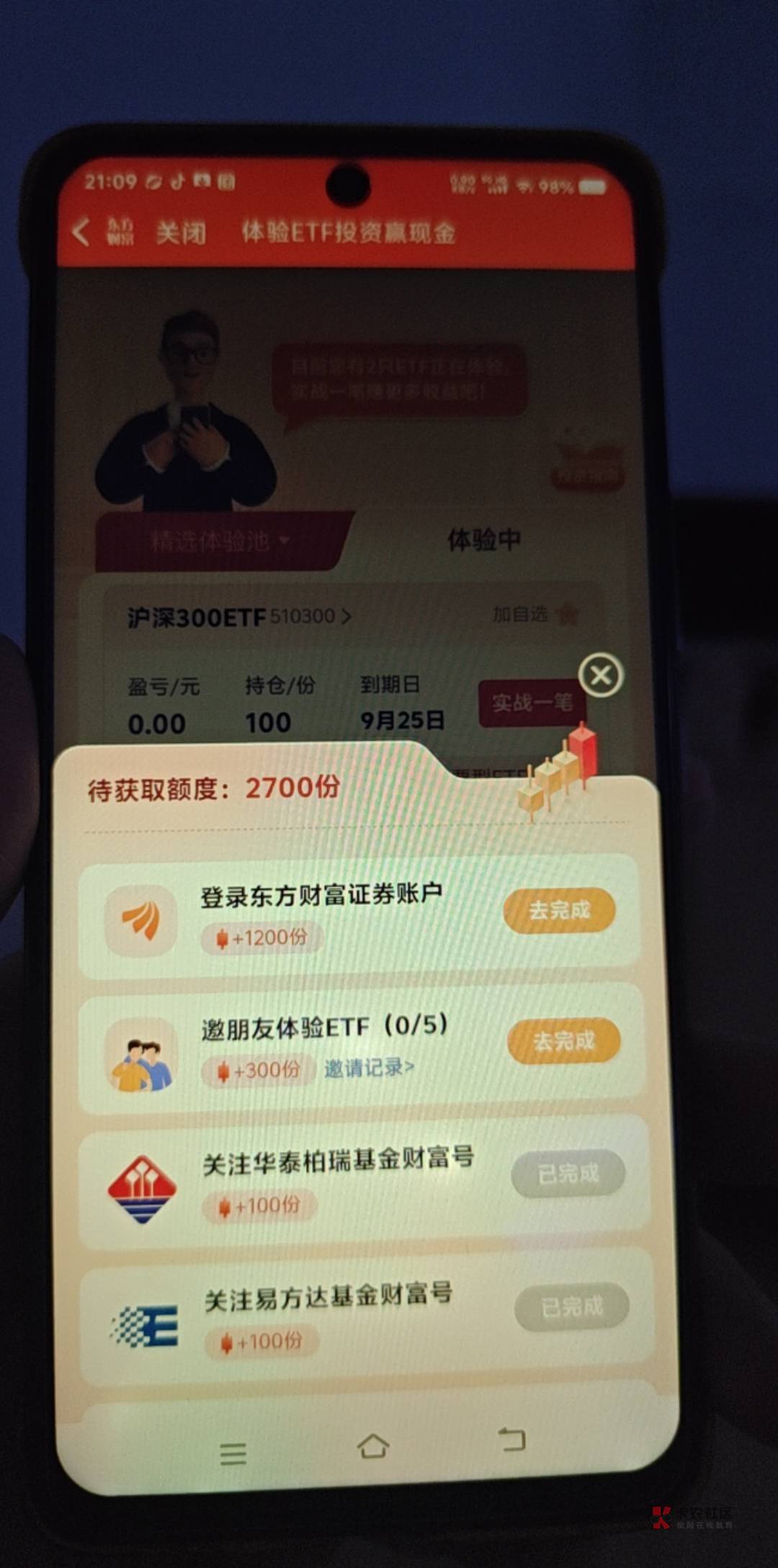 东方财富活动里面有个免费体验ETF,然后进去做任务领取免费体验金体验就行,不用拉人任务也简单就是浏览啥的,几分钟完事