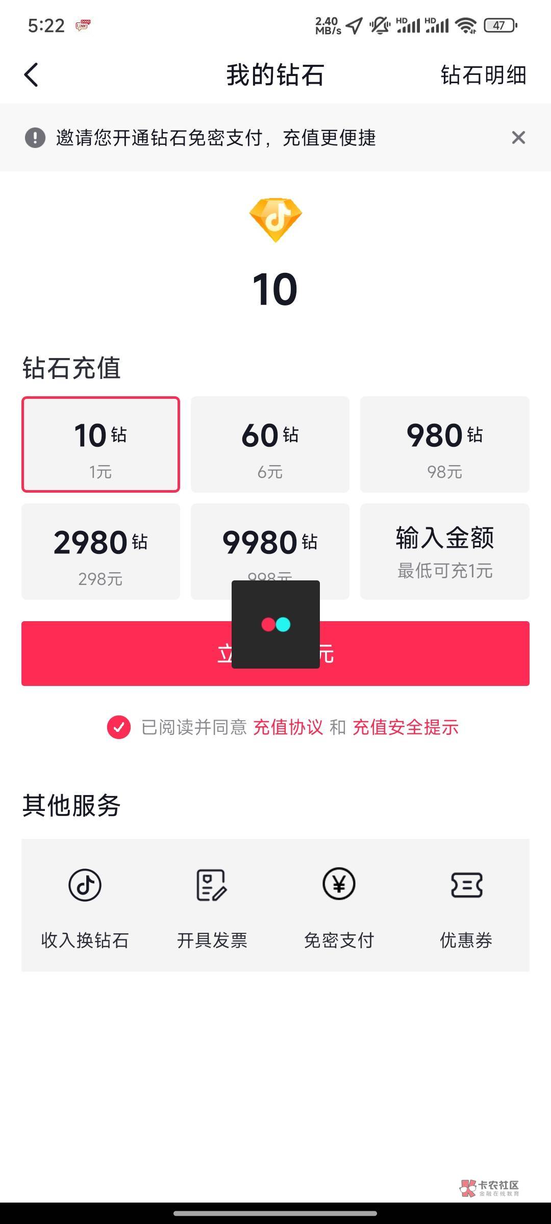 ,直接在抖音充值1块钱钻石