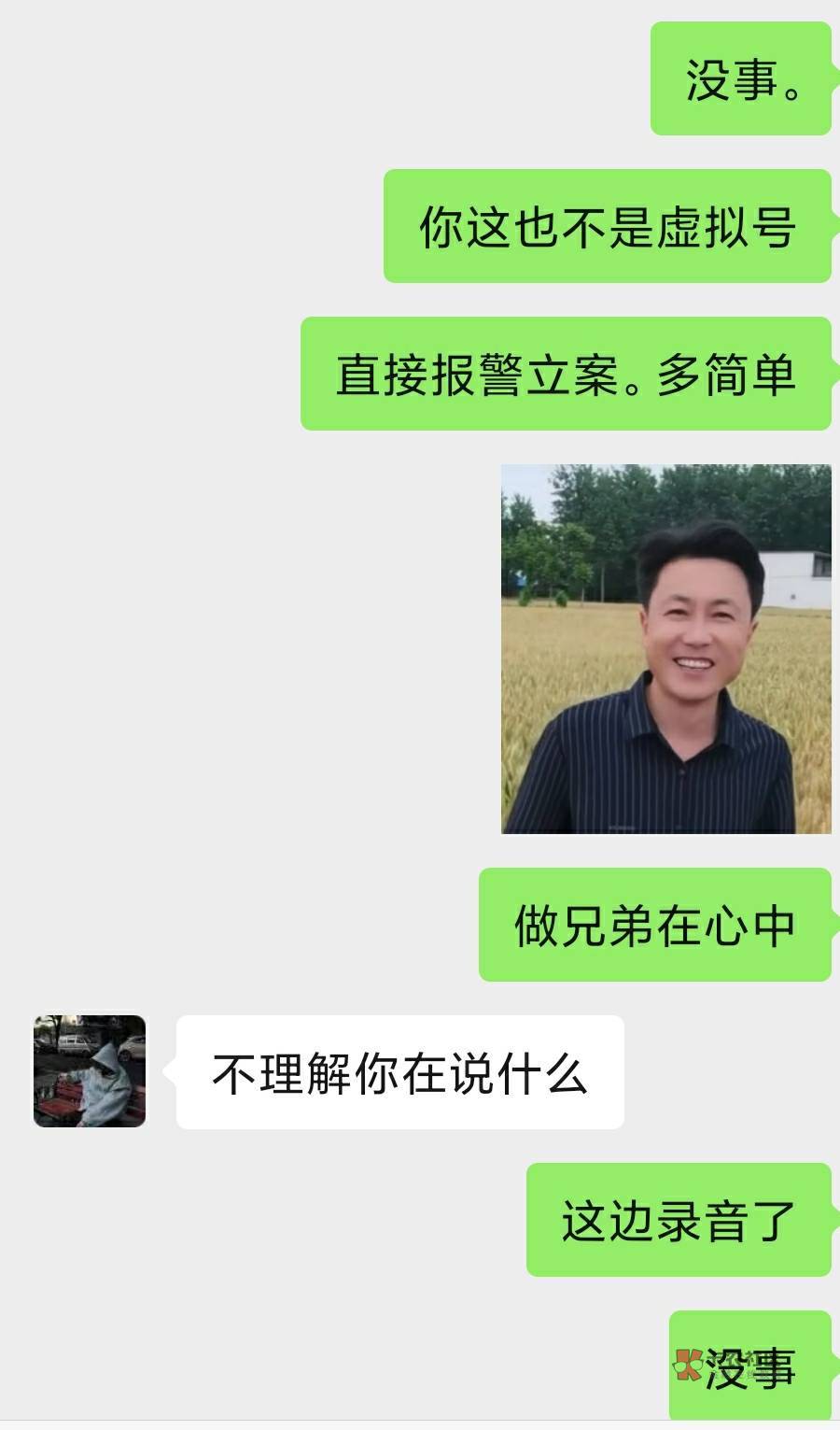 我寻思你开吧。我给他们一顿交流输出。丝毫没输。又各种骂一个个明显的听出急眼了。说开我吧又在这阿巴阿巴的浪费时间。又说线下碰一碰。丝毫没怂。一听就是几个毛没长齐的。给我电话挂了后手动轰炸了我几条短信。以为这是个虚拟号。然后搜了一下微。能搜到。加了聊了两句轰炸也停了