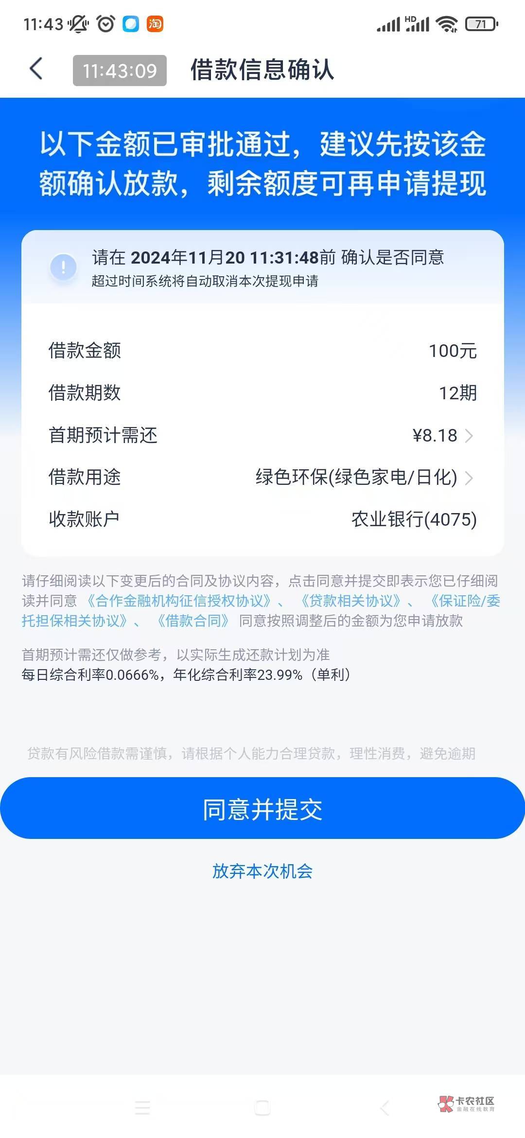 我也是这个界面,但是下面会有一个机构额度,你这就一个100块