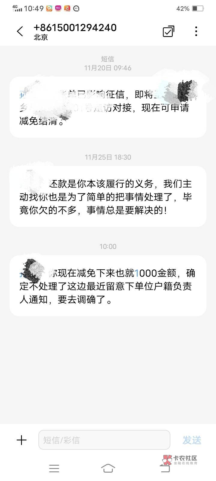 今天收到北京手机号给我发的 我的账单已经影响征信,即将来我家走访对接