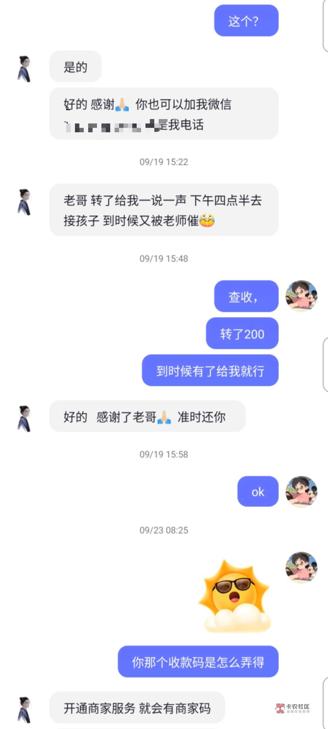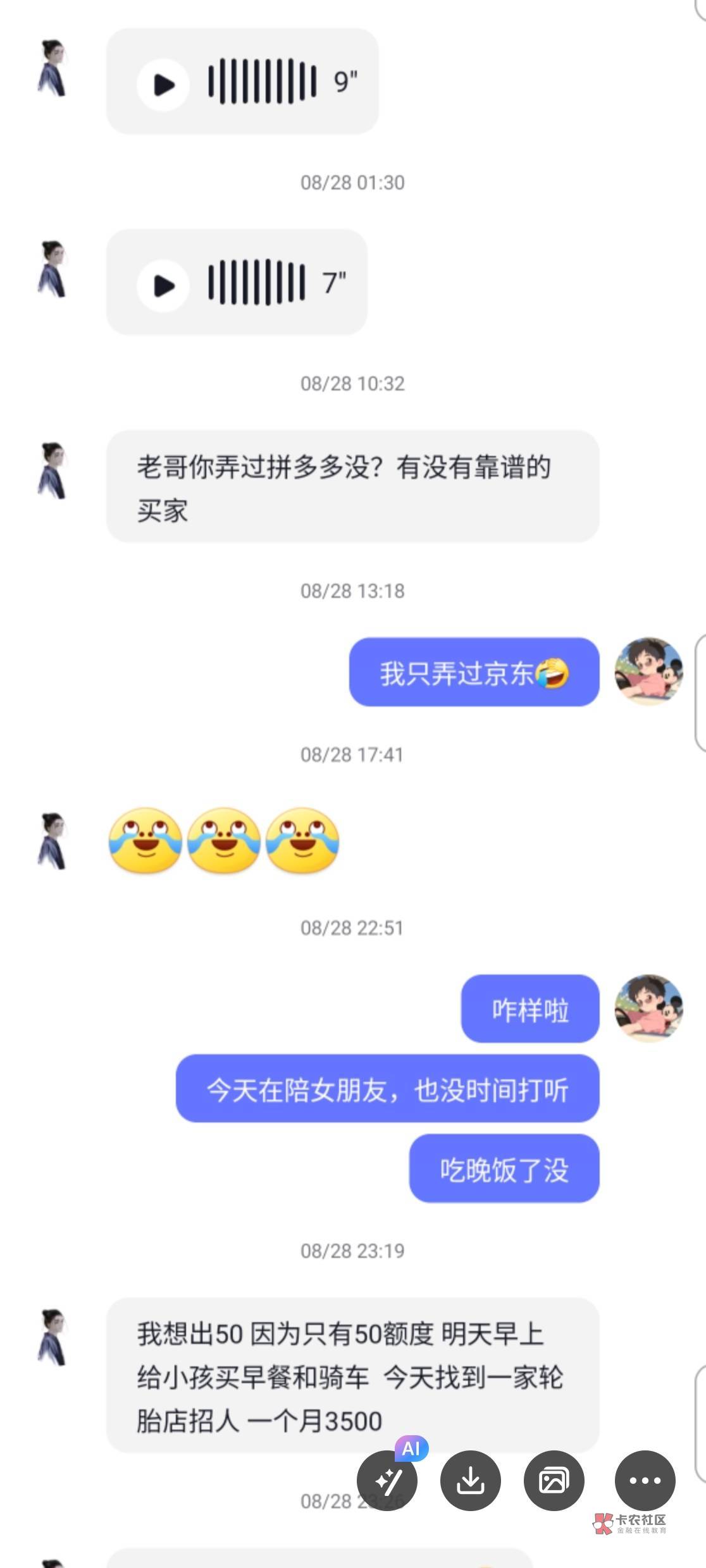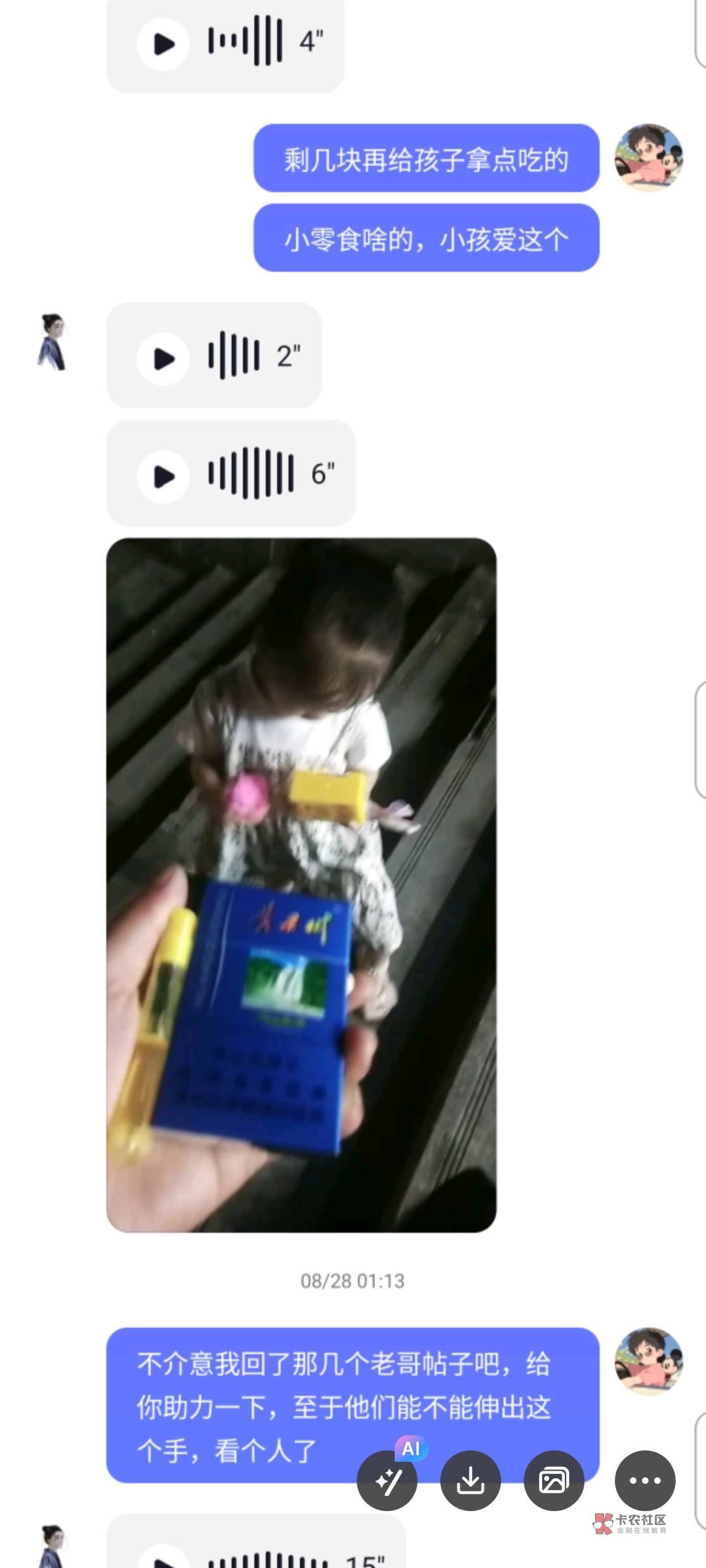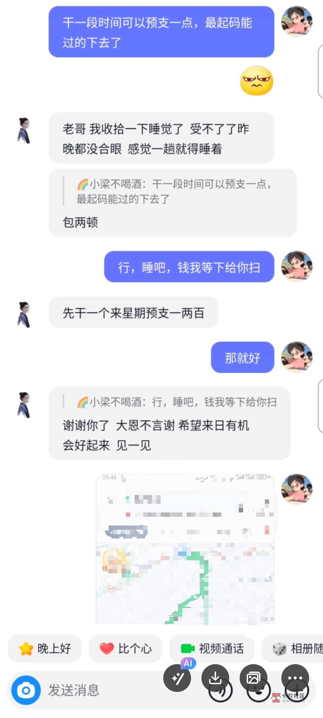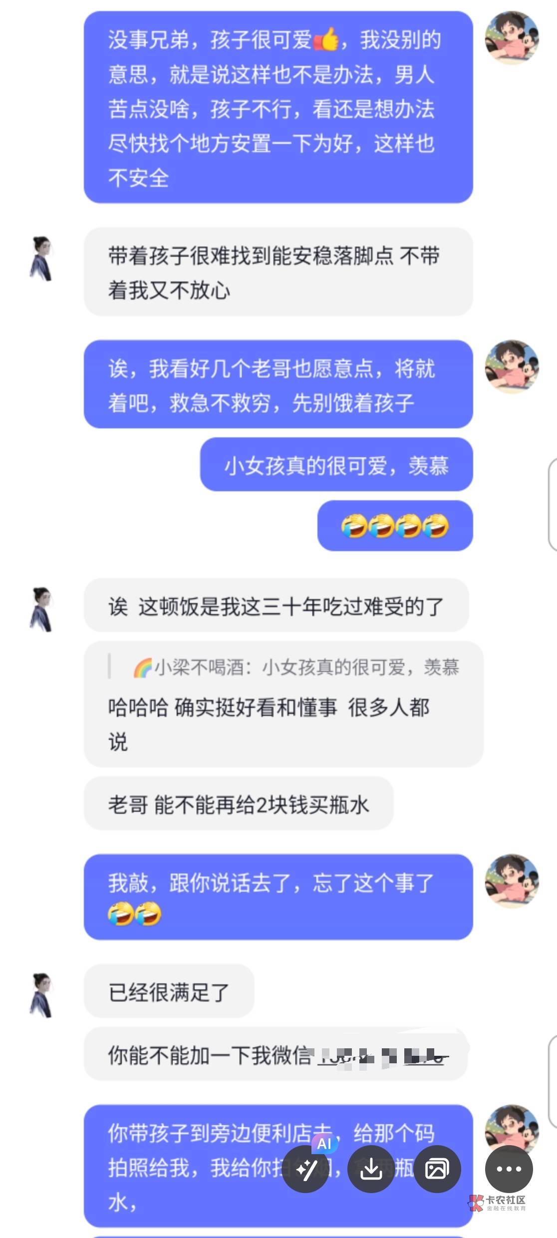 这楼主,我在0512这个地区,工作嘛,有中介的群,那天有群里有个人也是说没钱吃饭了,饿了一天了,后面善心大发,给了他红包30!中午给的,下午又找我要50 你这还说是借呢暮与晨 曦与霞 晚风和你 发表于 2024-11-22 21:24