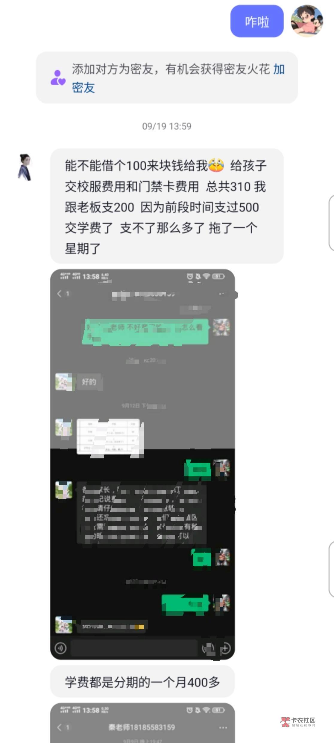 看着好像是真的遇到困难了,隔一段时间就找你借钱,骗子的话应该会一次性找你借很多,