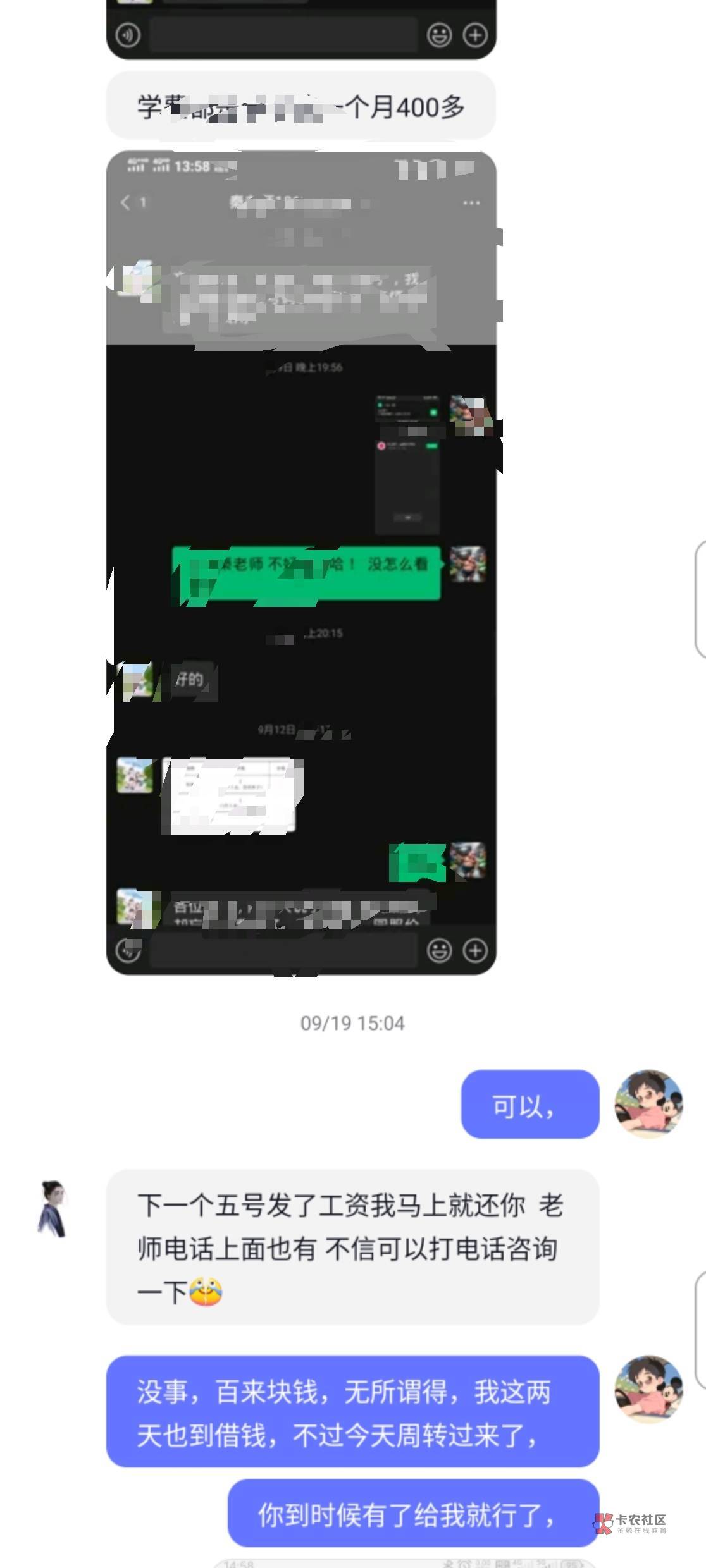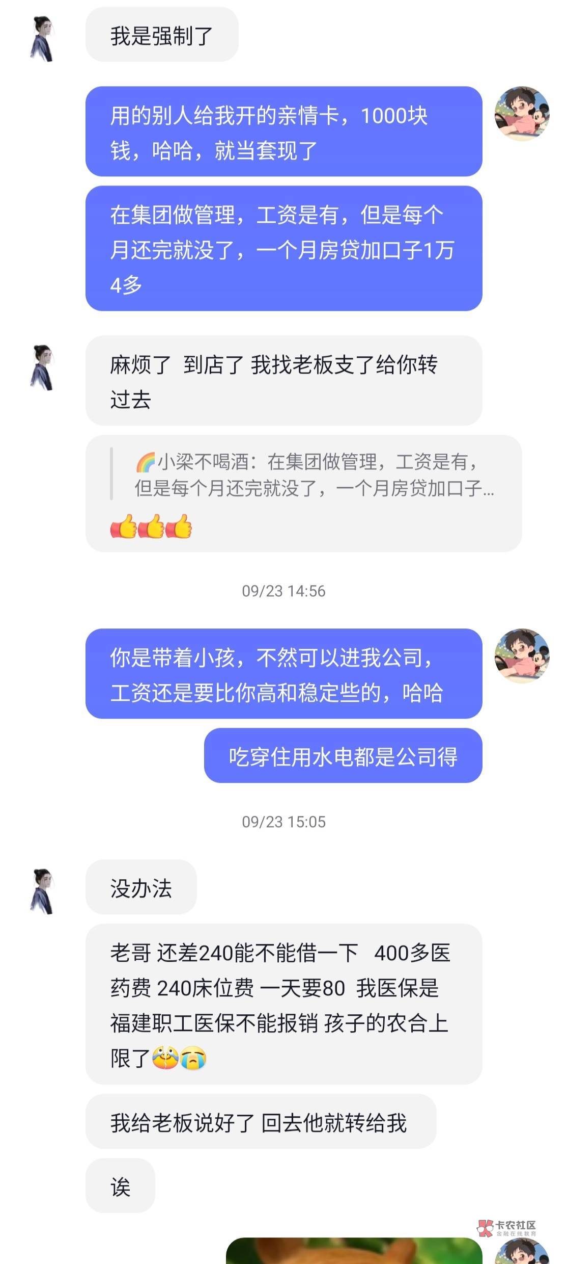 这楼主,我在0512这个地区,工作嘛,有中介的群,那天有群里有个人也是说没钱吃饭了,饿了一天了,后面善心大发,给了他红包30!中午给的,下午又找我要50 你这还说是借呢