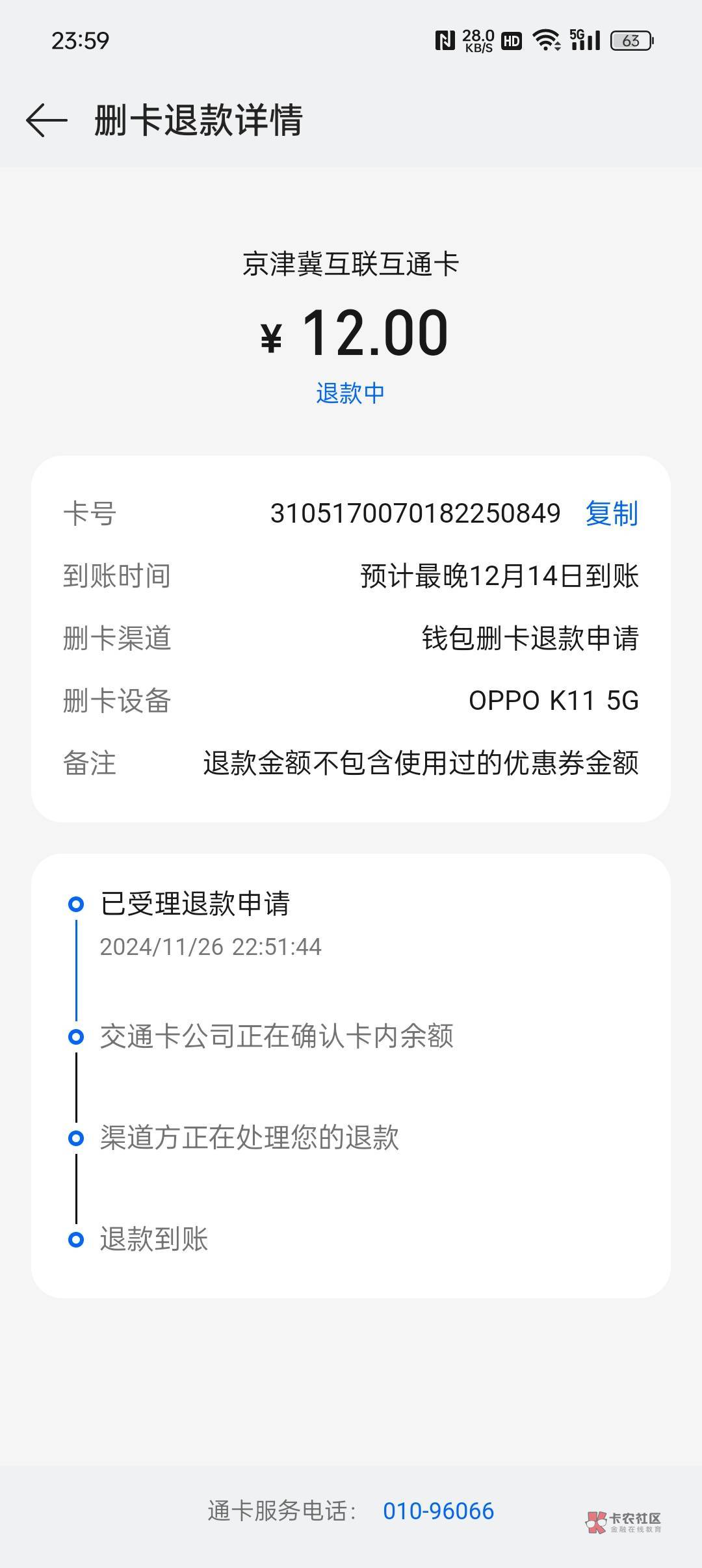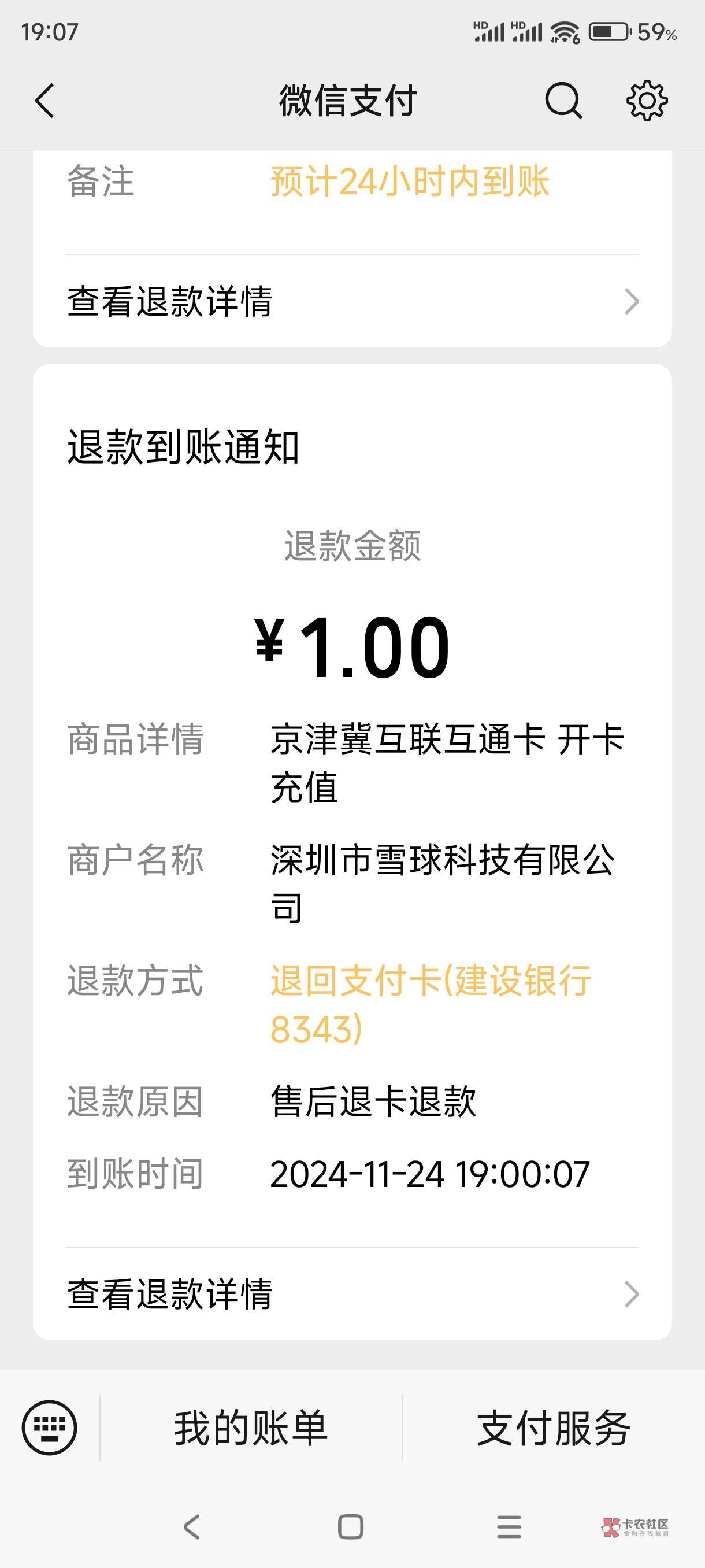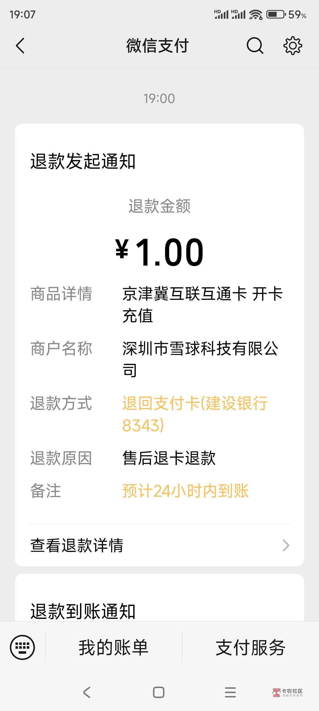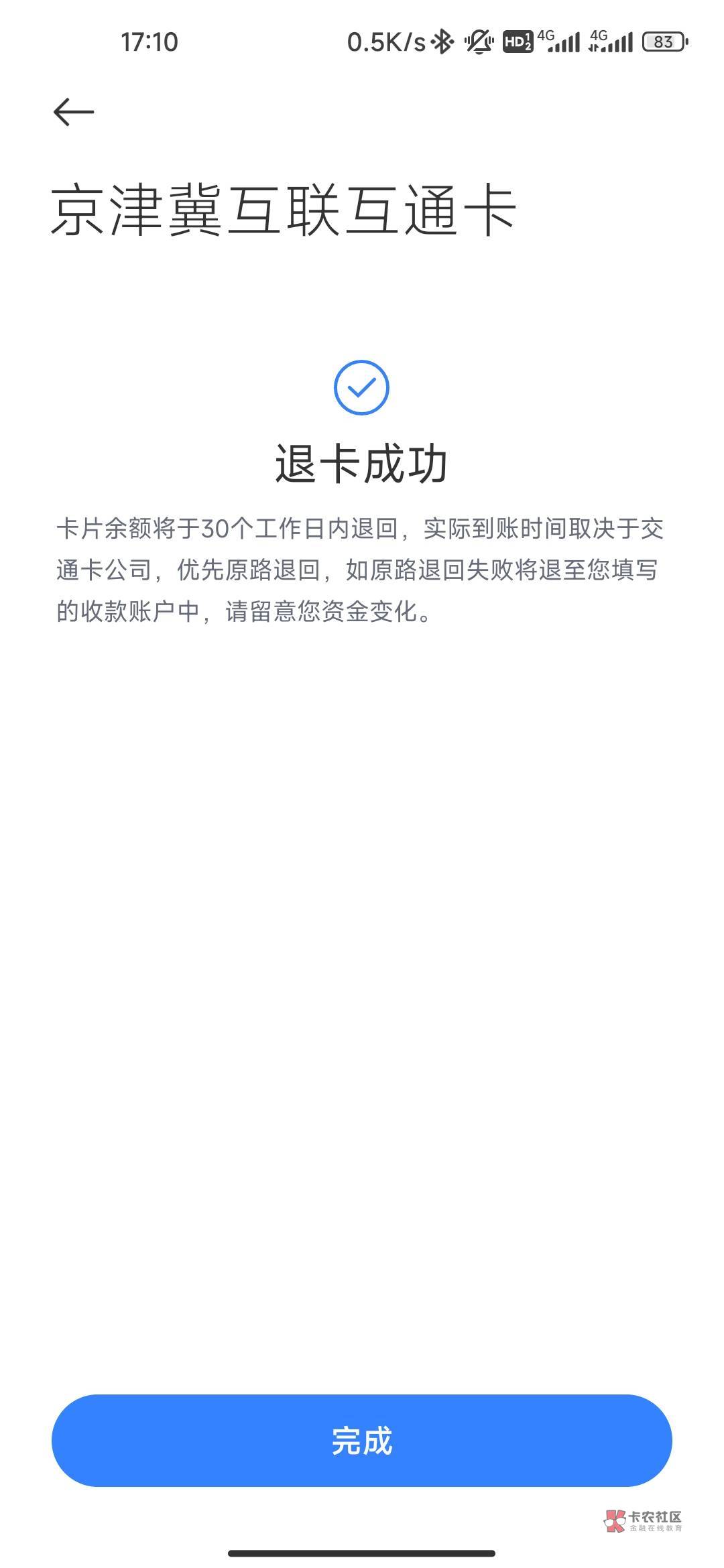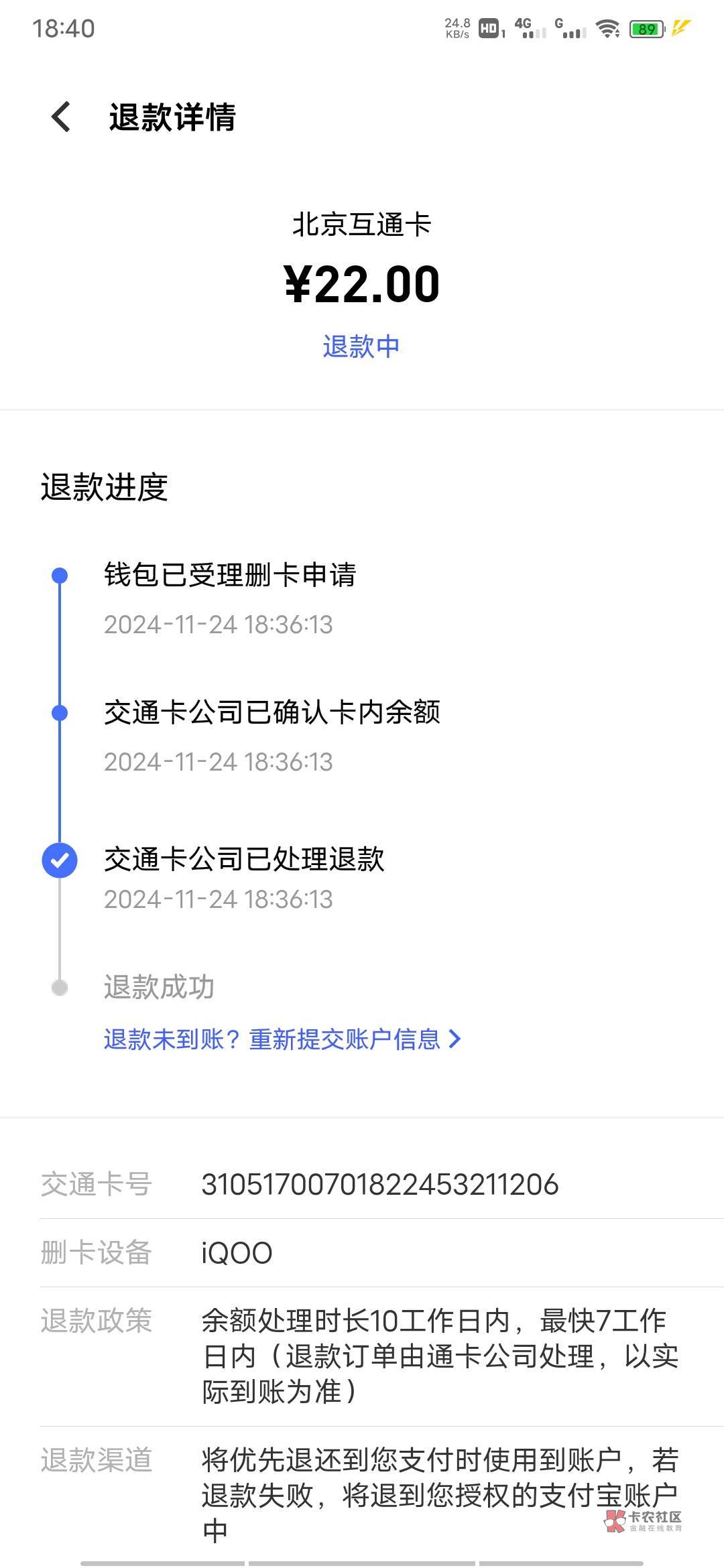 你退卡成功了?我这写着原路退回