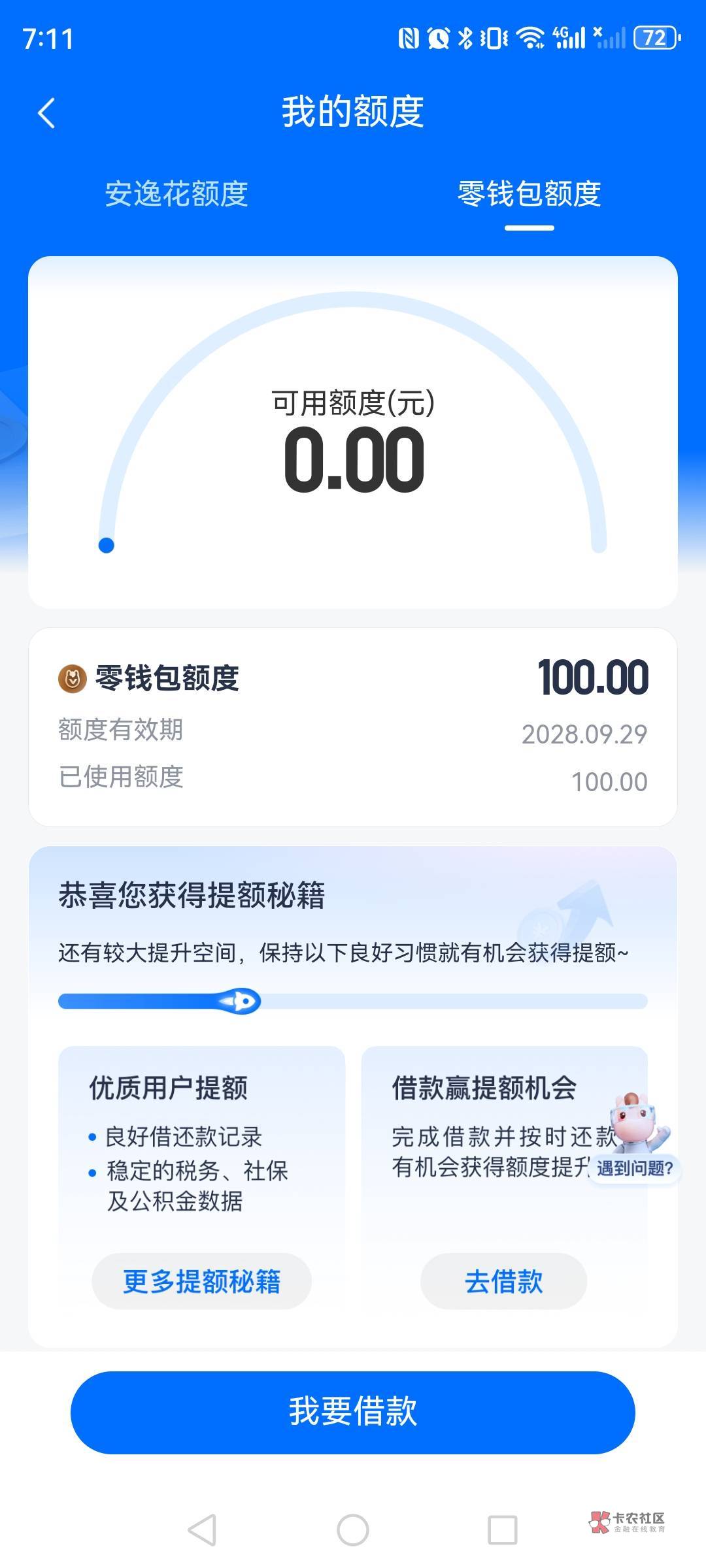 T路可以试试在点开去提升额度,当前已用额度如下图位置,然后有两个额度一个正常的,一个零钱包,那里有概率能下