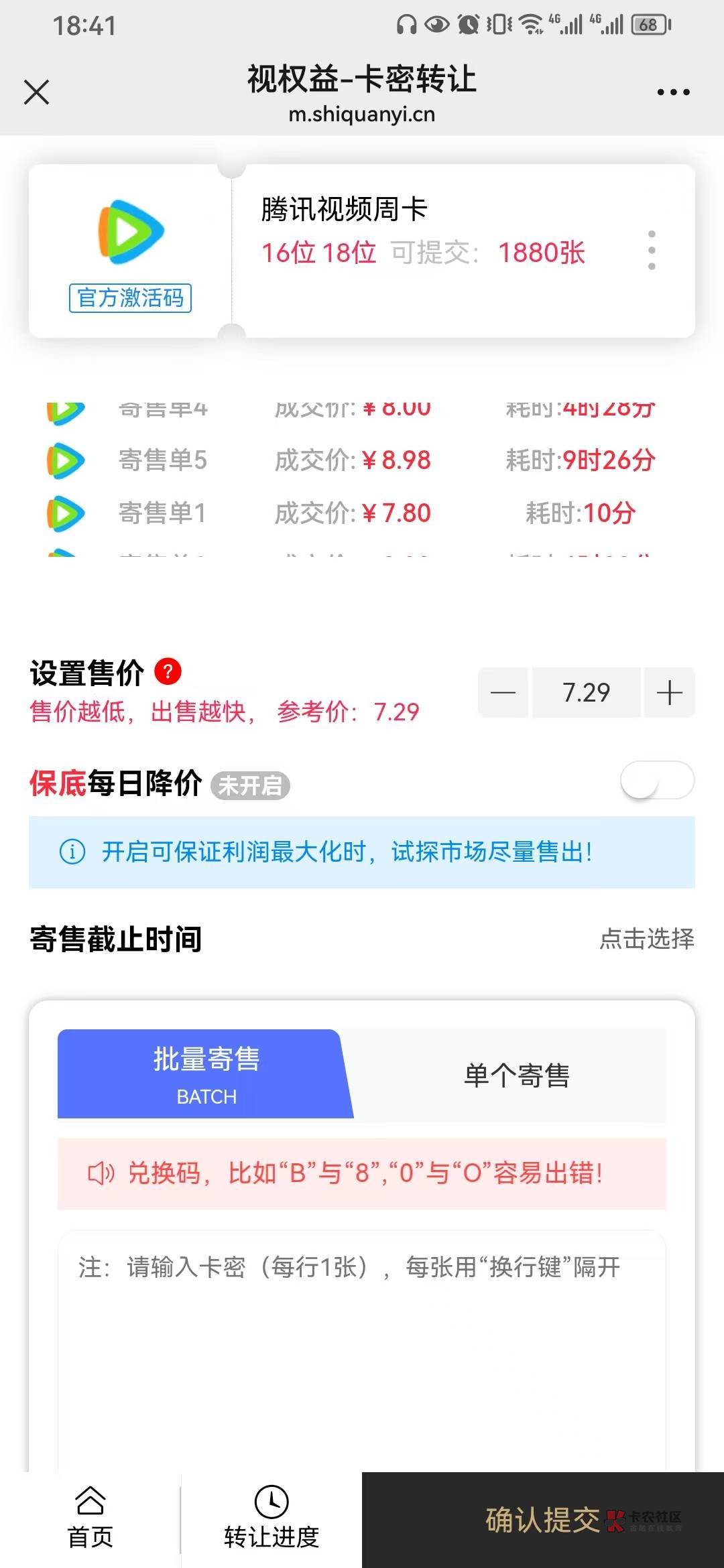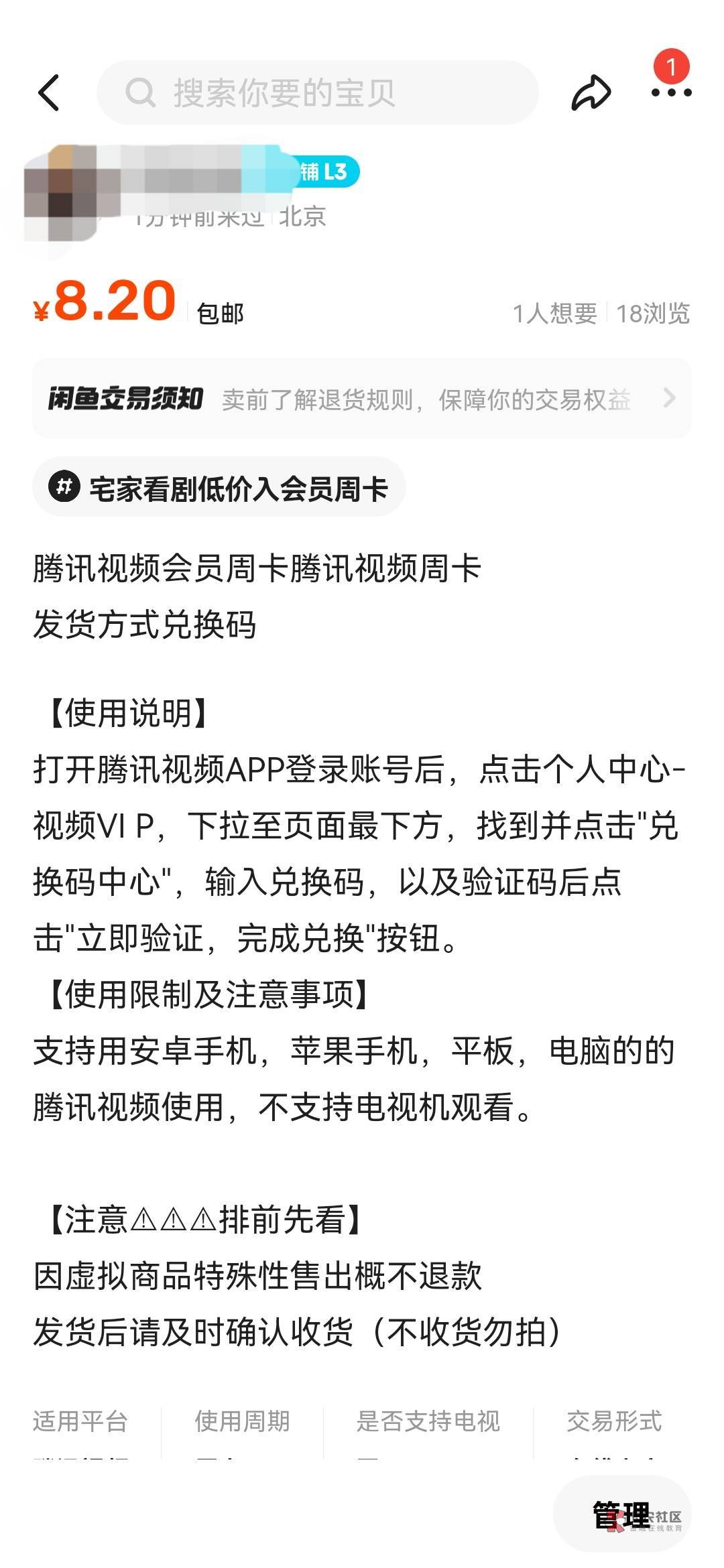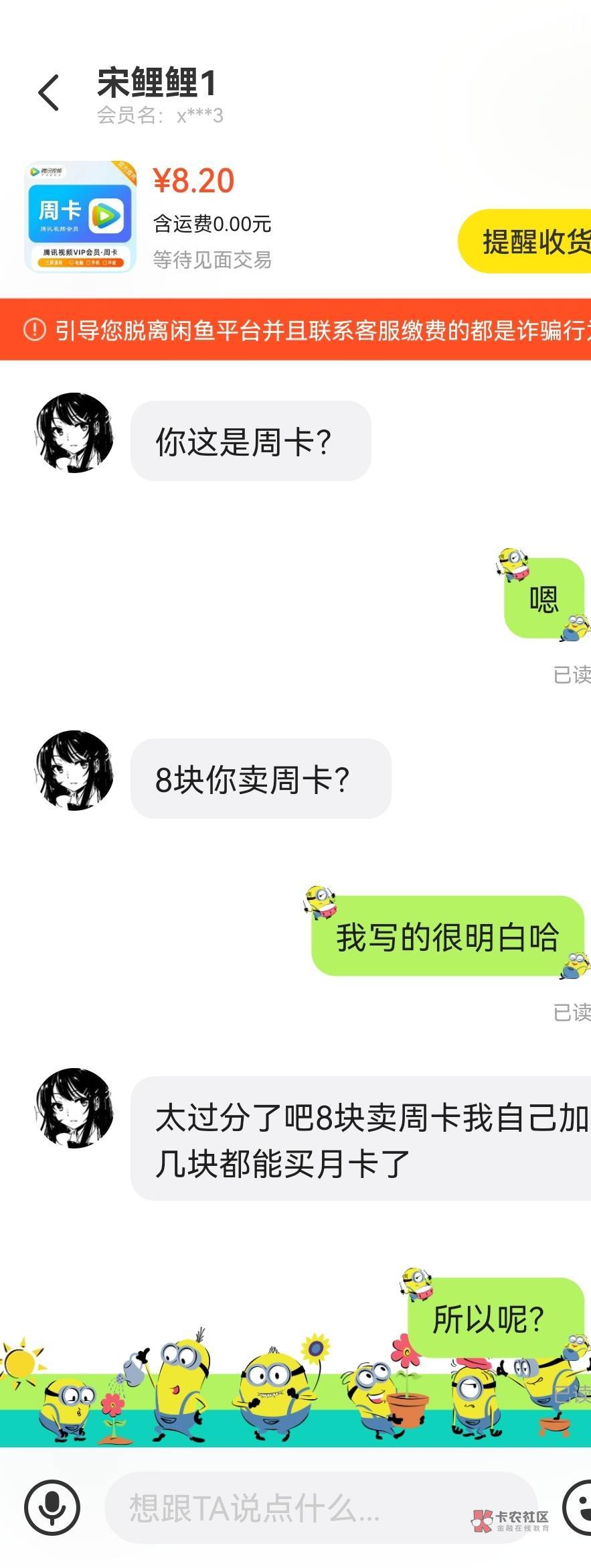我看视权益周卡都快9块了,就想着卖8块吧,我也很无辜的