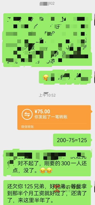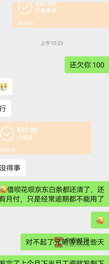 举个列子,比如我欠你1000。每个月工资就那么多,我要给父母自己还要生活,女朋友也没有耍,还要还网贷,一次还不清,就兜里有钱了就还,50我也转我也还我只要有钱,确实丢人,