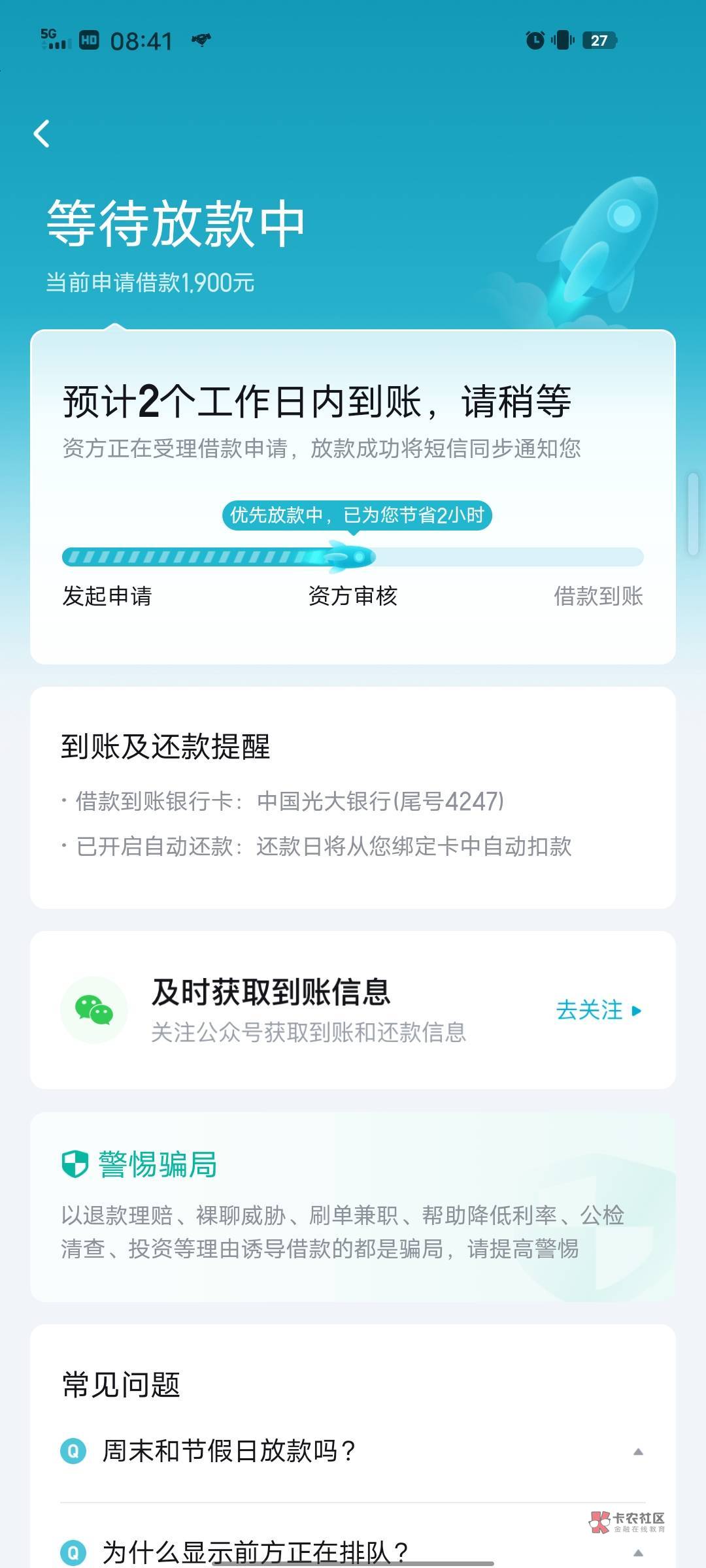 我昨天中午十一点多申请的,和你这个一模一样,到现在还等着呢,进度条到75%了,不知道啥时候到账
