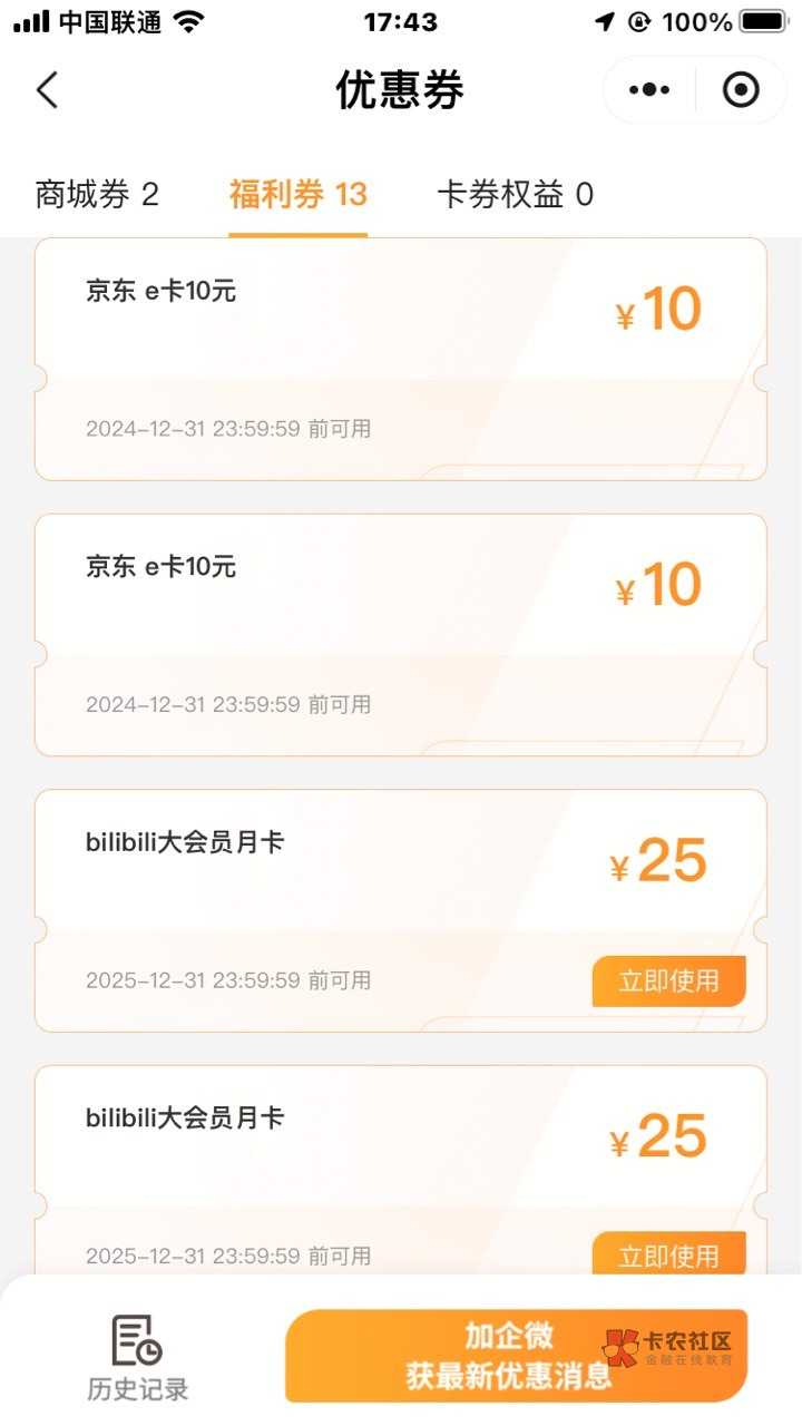 自己卡券里领啊