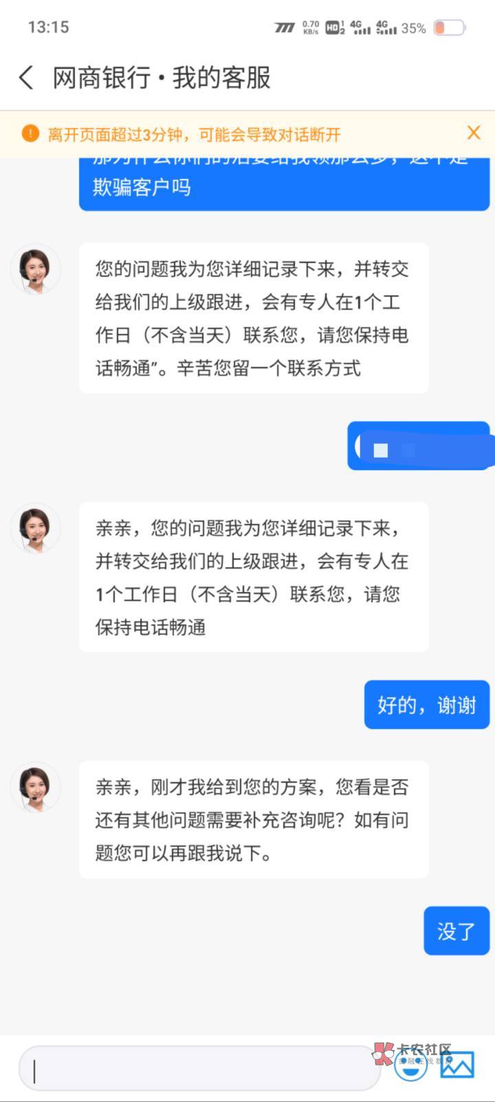 然后他会联系客服经理给你上报。客服经理打电话就问你赔偿50愿意不,直接跟你说了,愿意就三天之内给你转
