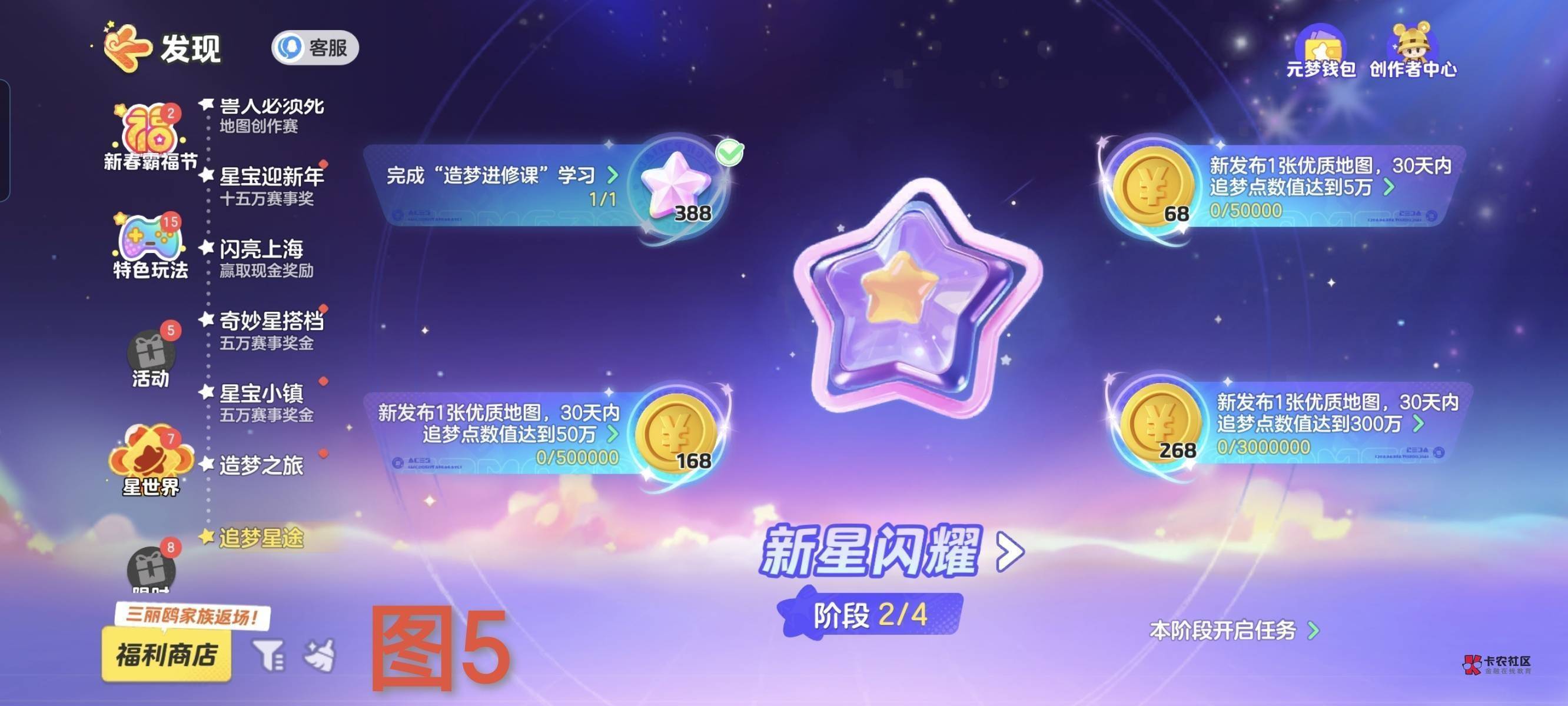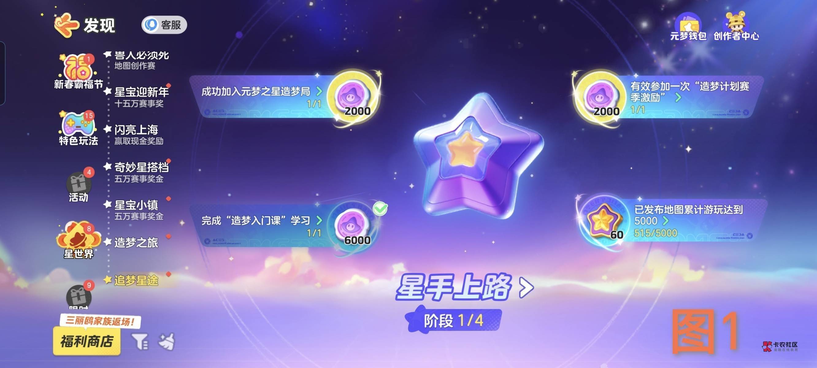 入口:主界面-右上角[发现]-星世界-造梦星途,进来先做图,做一张上传后,等审核过了,自己再进去那张图通关一次,可以进去图1的四个任务界面。