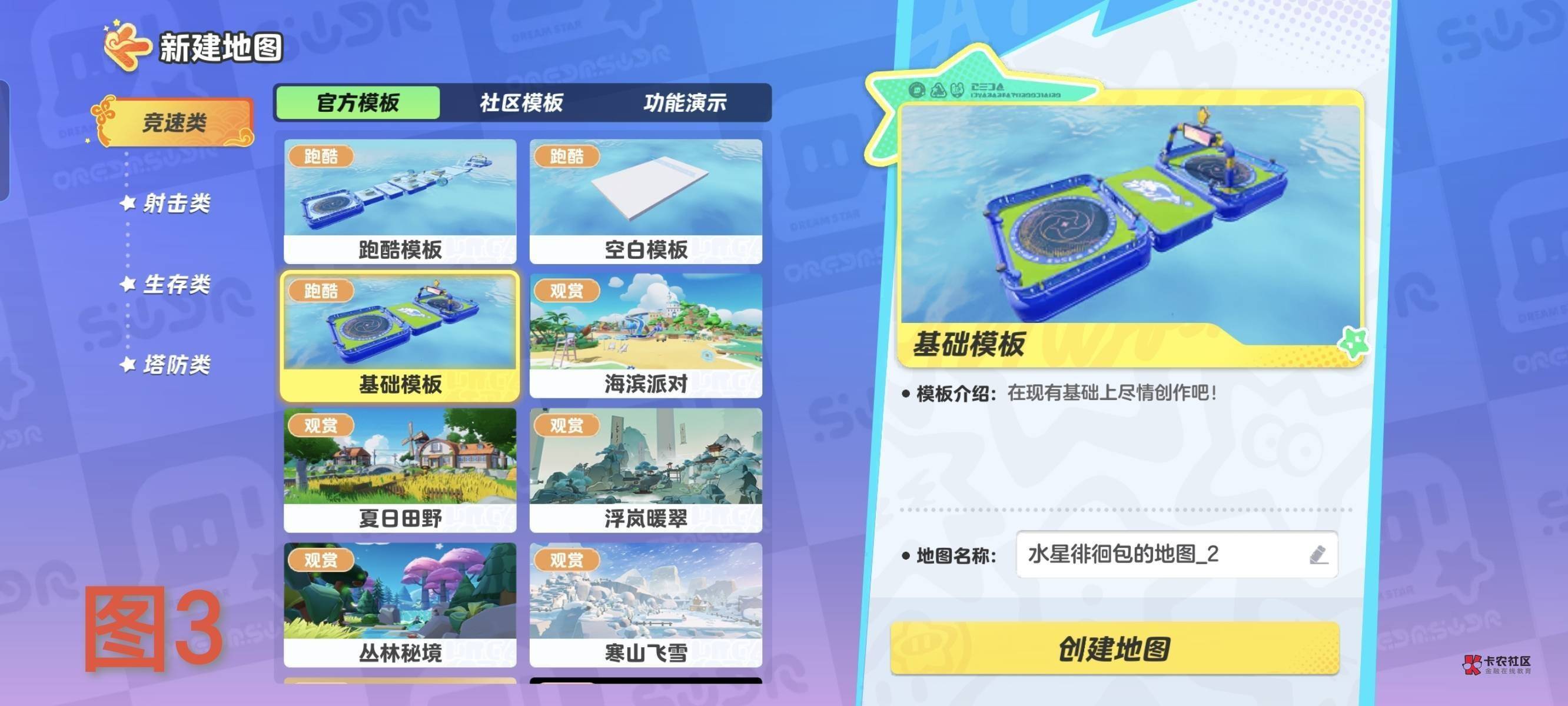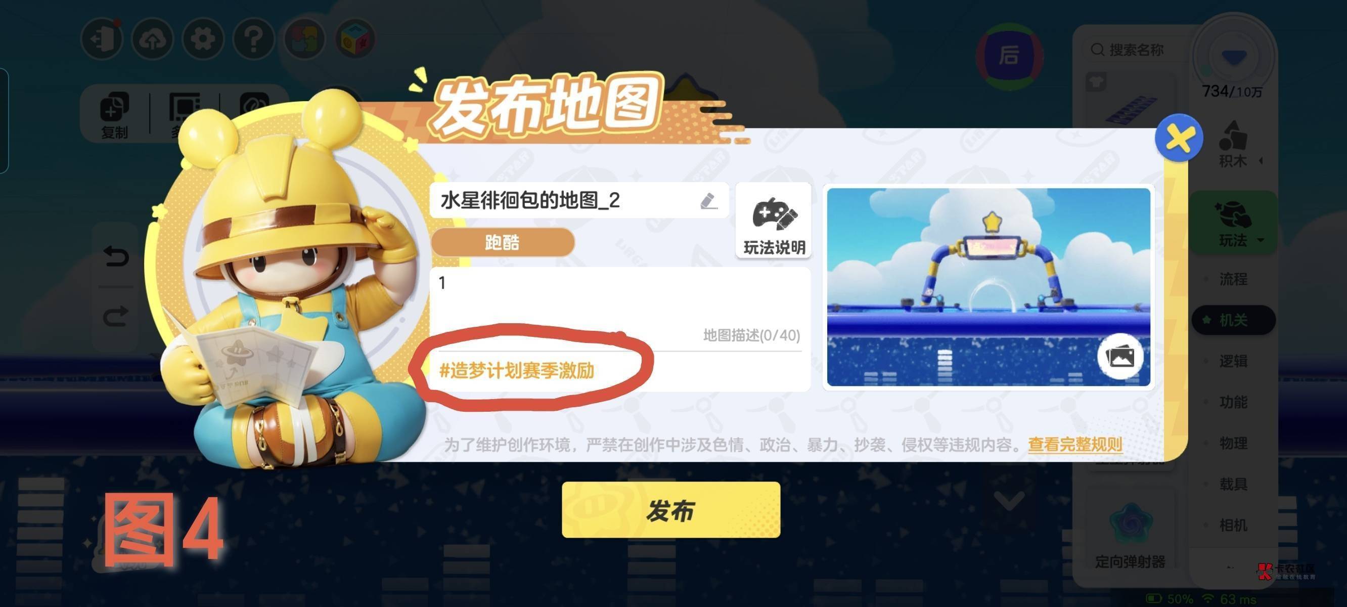 做图,选图如图3,什么不放都行,做第一张图的时候把胜利触发放在脚下。然后发布。这时候你的草图里就有一张图了,点进去草图,详情,进去后退出,它会提示你发布或者保存,选择发布,改一下图的名字,比如1改成2,添加游戏模式发布。重复过程,做20张图,