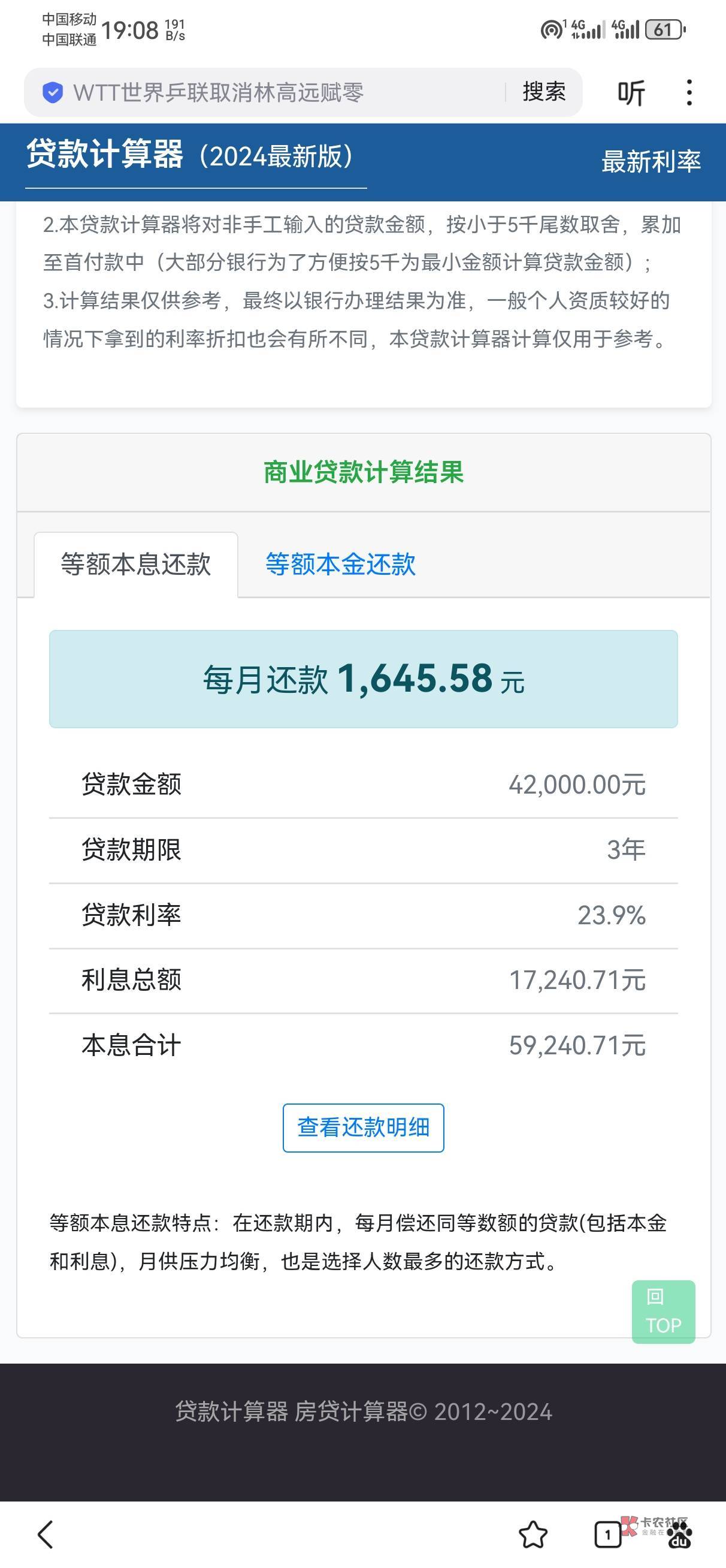 刚找了个计算器又算了一下,4万2,3年总共还6万