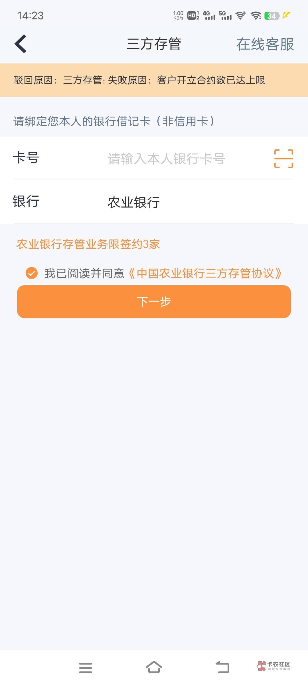 就是扫了那个农行码开户,资金号出来了,存管没绑定成功,换卡号绑定存管也限定了农行卡,农行上限