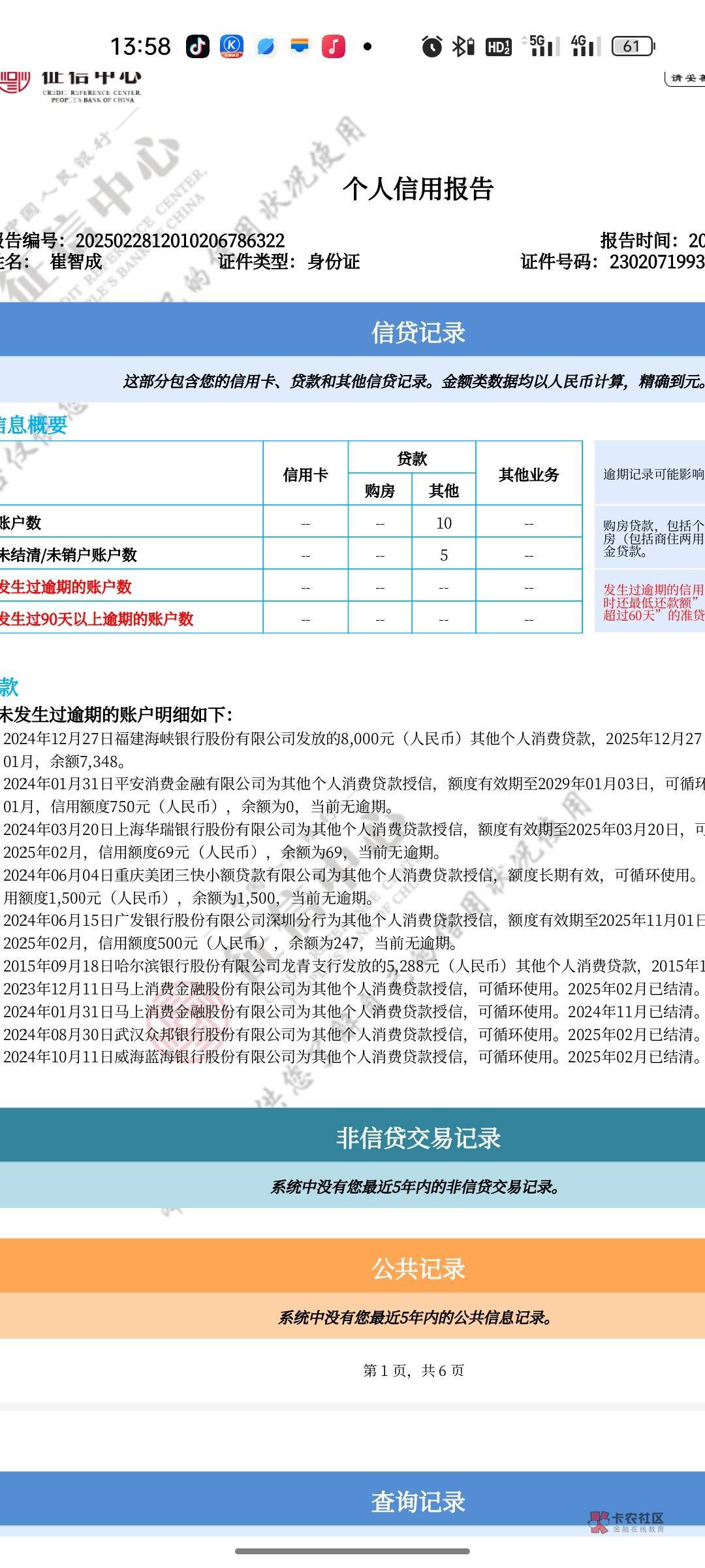 - 整体信贷情况不明:这只是征信报告的第1页,共6页,不清楚后几页的详细内容,比如是否存在其他未展示的不良信息、查询记录的具体情况等。如果近段时间有较多的信用卡或贷款申请查询记录,会让银行认为你资金状况紧张,从而降低申请通过几率 。