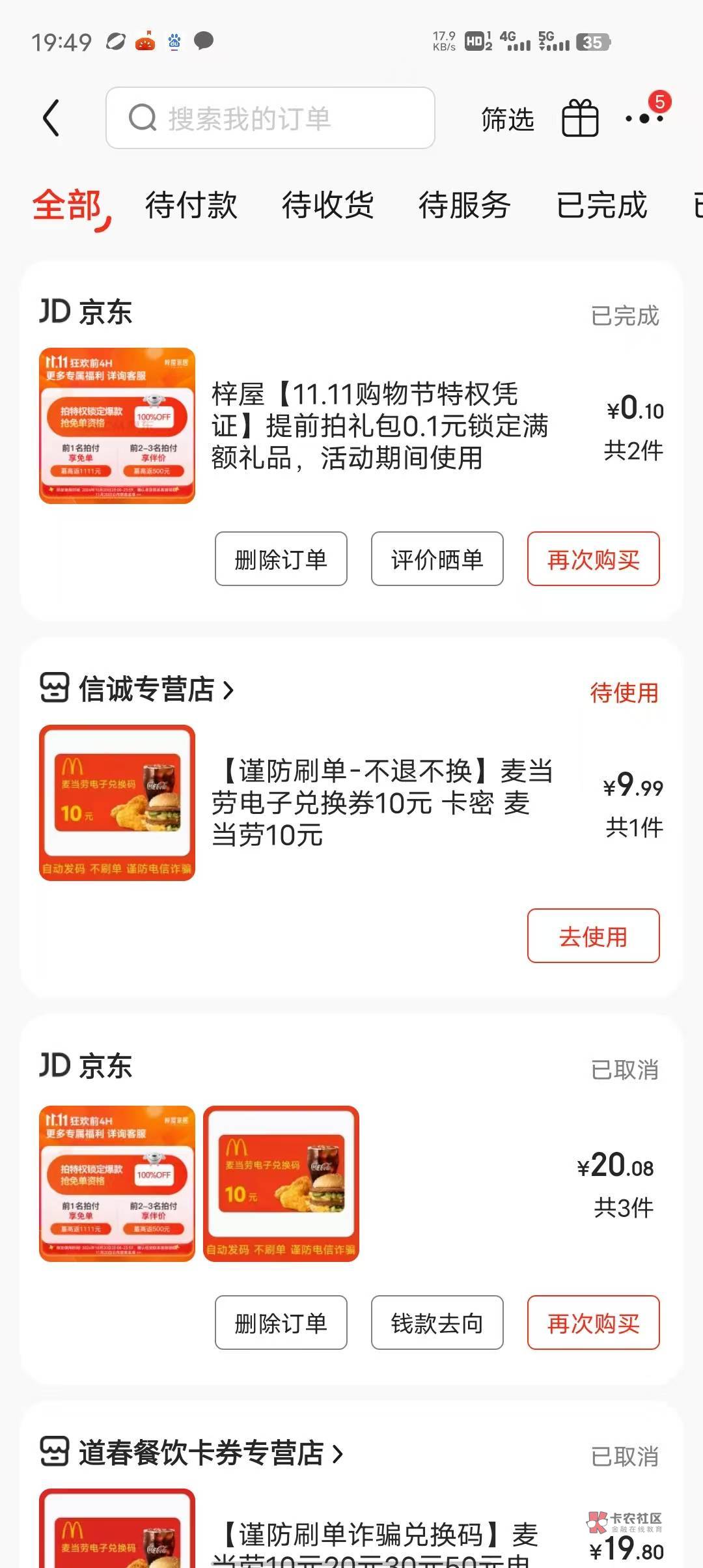 这是我上次买的,两张9.9麦当劳+0.1特权刚好20-10