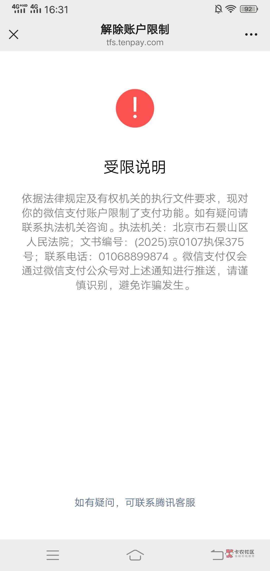 微信没事最多半年或者1年就能自动解开 我是支付宝6月 解开以后 在冻我微信也6月自动解余杭 jc叔叔不知道真的假的冻结前一直电话 我是不承认 然后现在一点事没有过去4.5年了