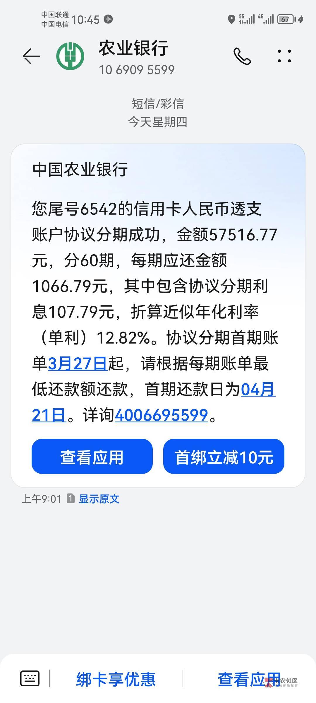 就处理了呗,主要是现在工资卡换成农行了,不处理不行,想着分12期,每期1000多点,没什么压力。农行现在确实很快,中午就有电话打过来了,直接就确认了一下金额和期限,然后就给办了。