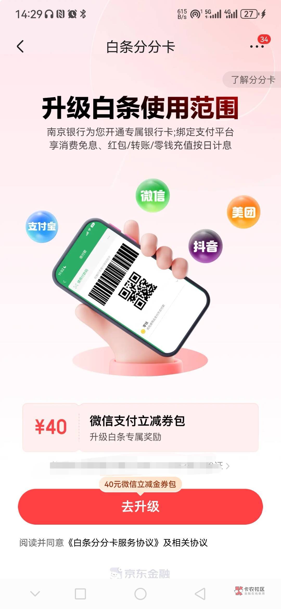 绑定微信送15+5立减金,消费两笔送20+5立减金。需要注意的是开通最低就是三期,要在第一期还款前还上没手续费。
