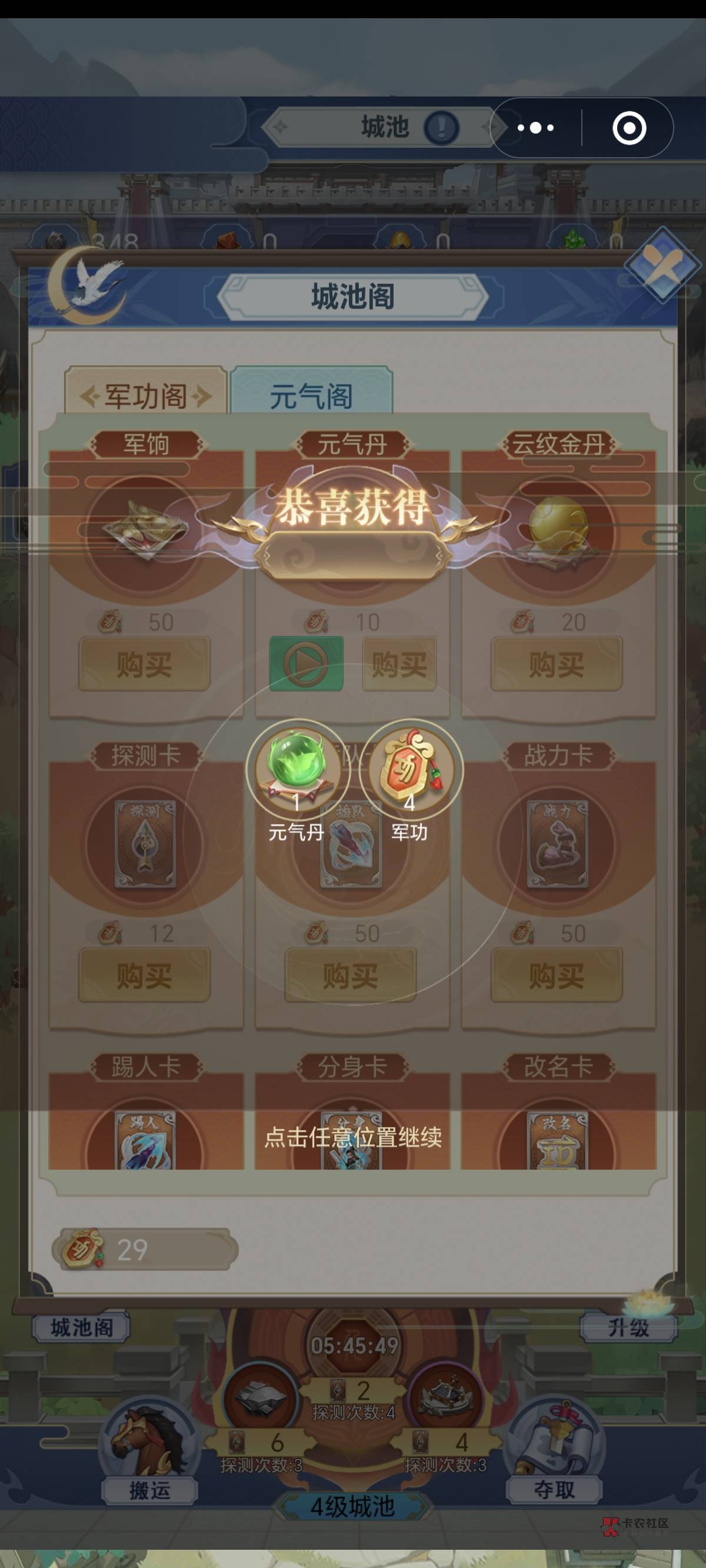50军功兑换1军响,1军饷0.2-0.3米,上图左点击军响赠送微信链接出售下图是军饷兑换路径,城池阁进入军饷阁,50军功购买,元气阁元气兑换升级材料,元气丹这里看广告做任务