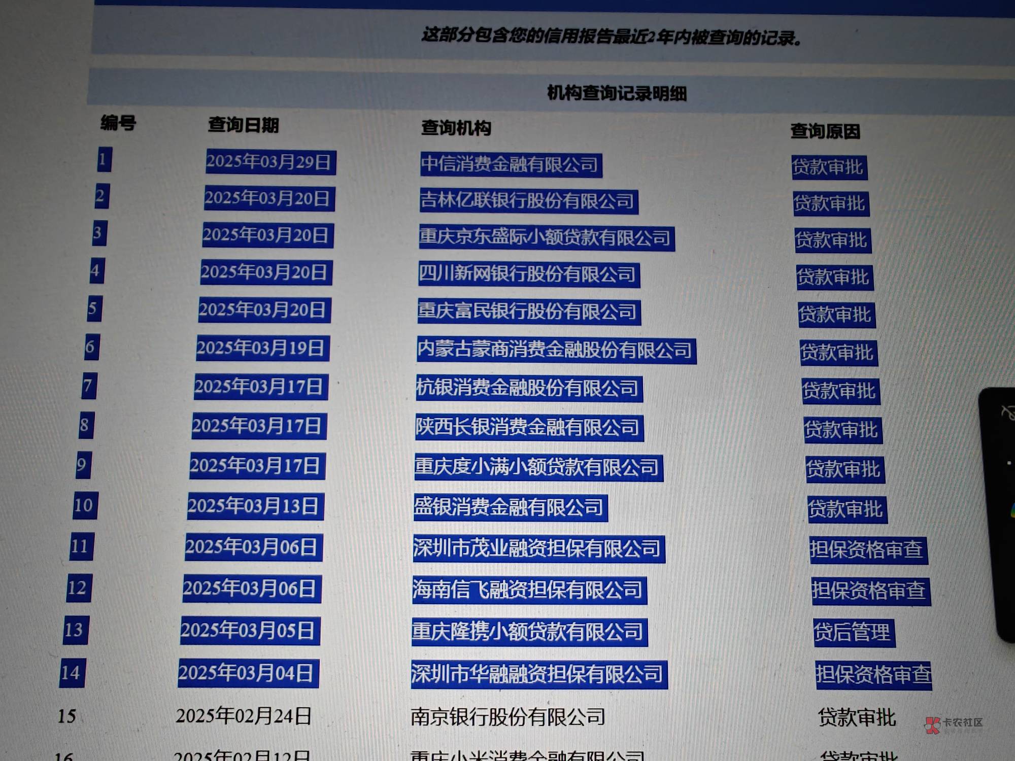 刚刚看了下征信报告,3月查询爆表了14条查询