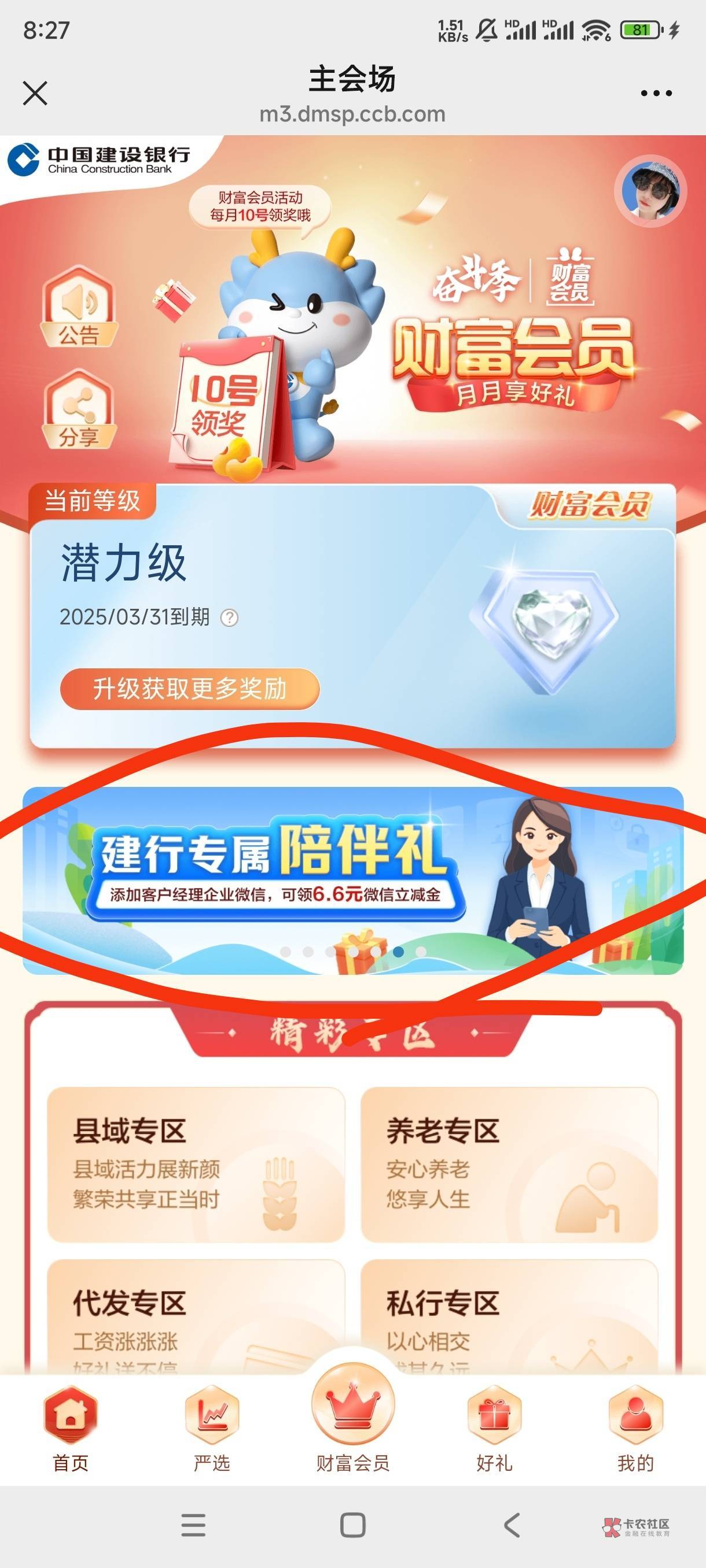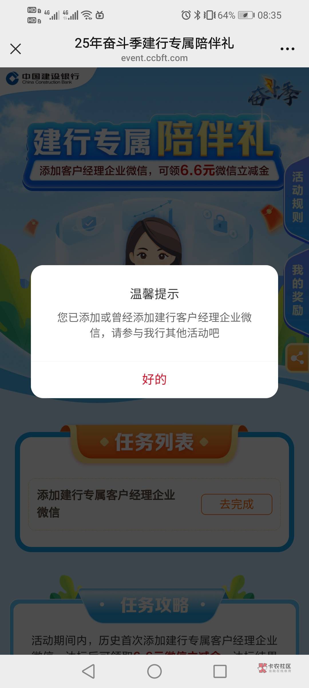你换个新微信没添加过这个客户经理的微信登录试试,咱上次也是添加过领过一次6.6这次的也是直接又领了6.6的