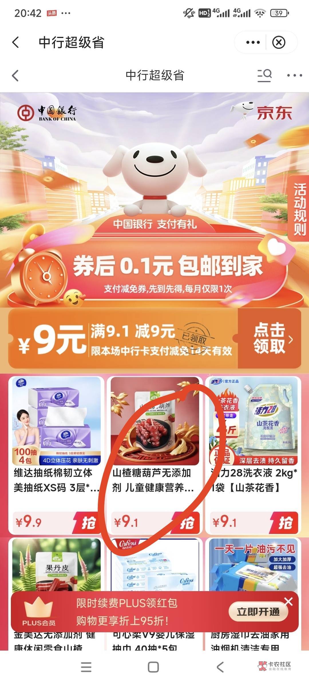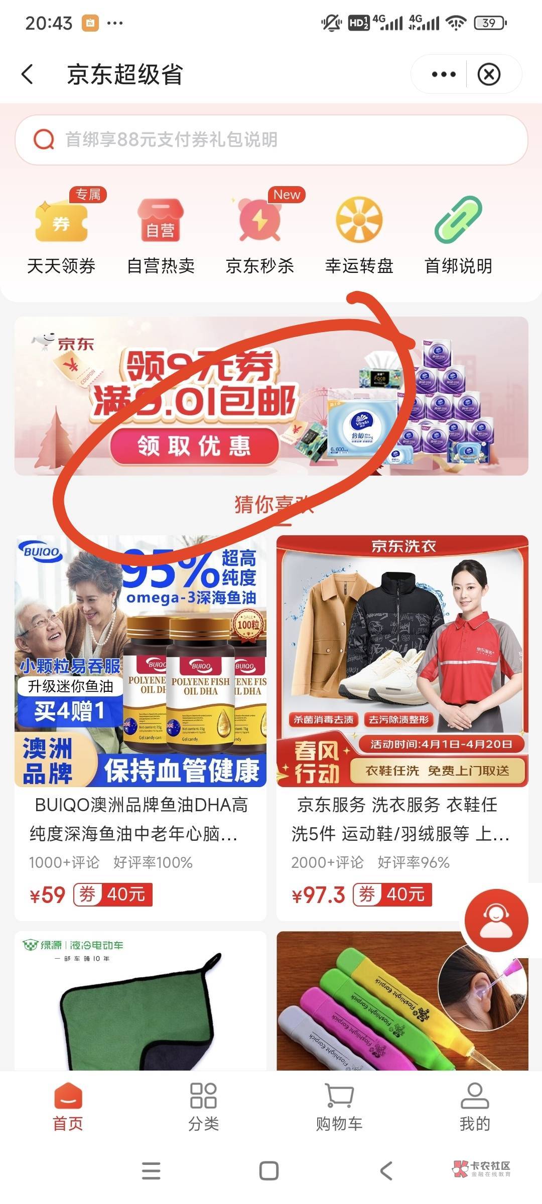 看图,没优惠就点横幅那个9的卷,随便选一个商品,点进去,立即购买,不要付款,然后再去付京东那个订单就行了