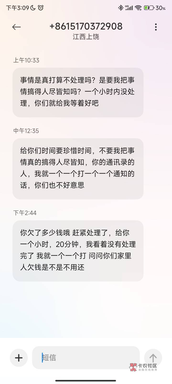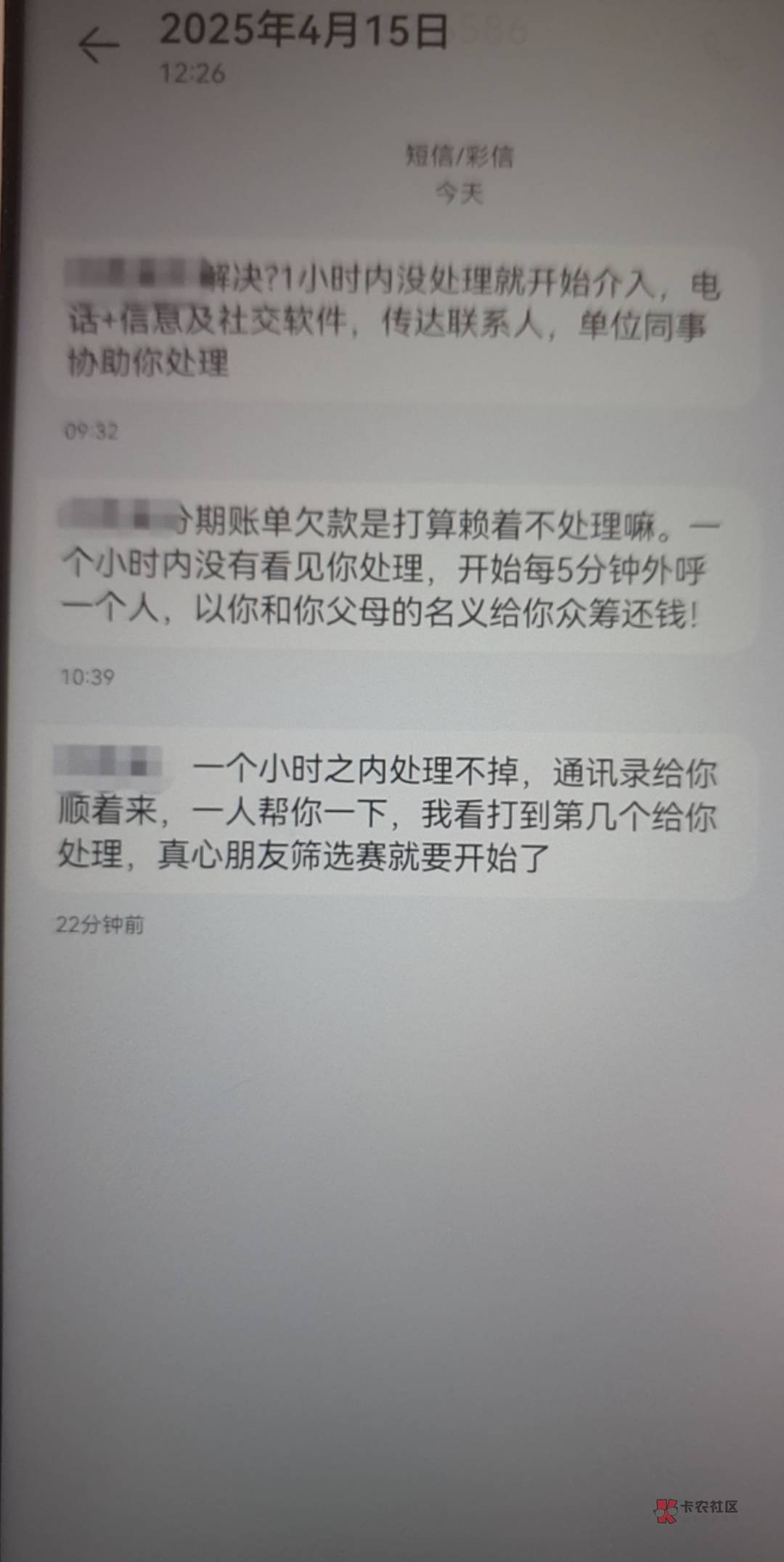 没有,我等两天都没事,然后拿着这个短信全部平台和资方投诉一遍,不管是谁,然后基本都是打电话过来和我说联系我本人不会联系第三方,很客气