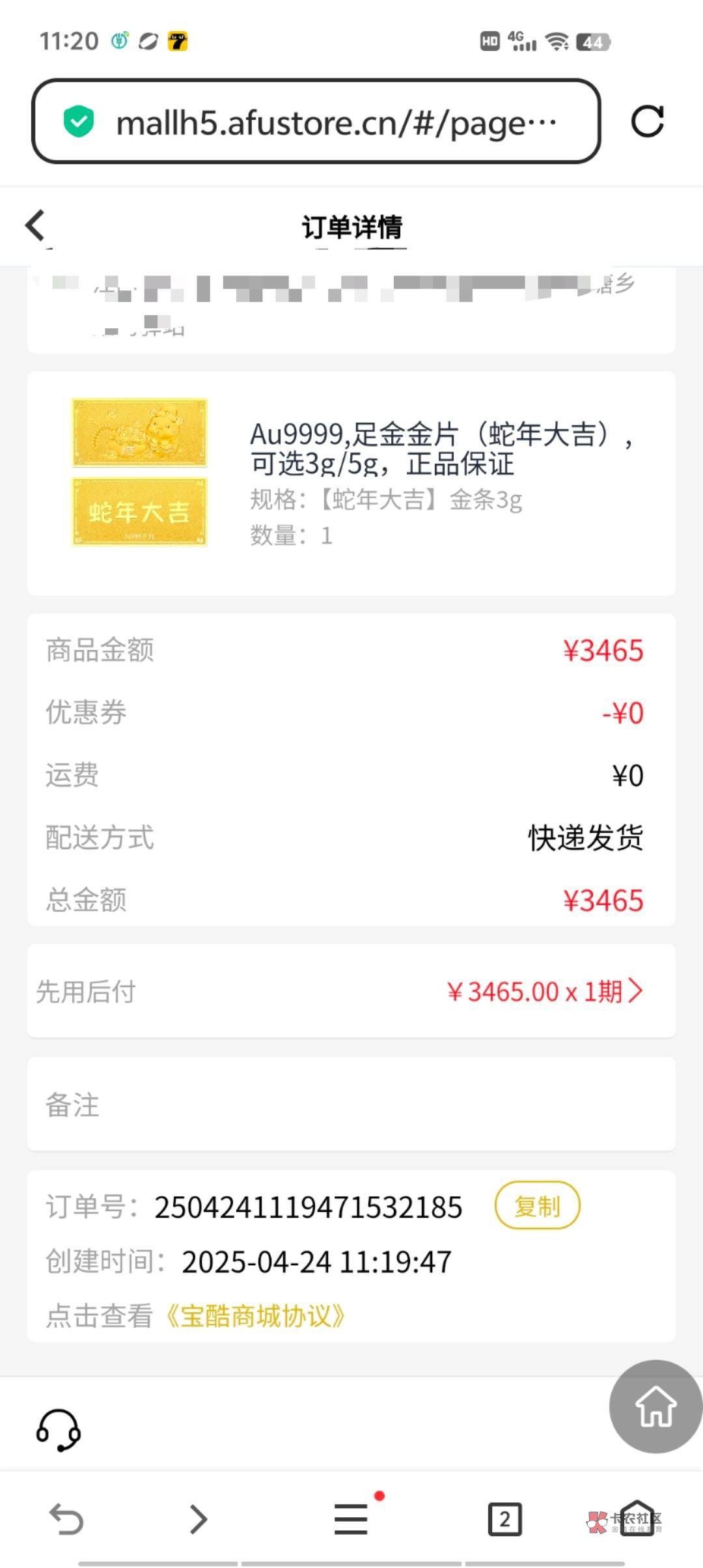 就一个中介勾八不发货,宝库加客服wx审核发个芝麻分就过了,第二天顺丰就到了到付