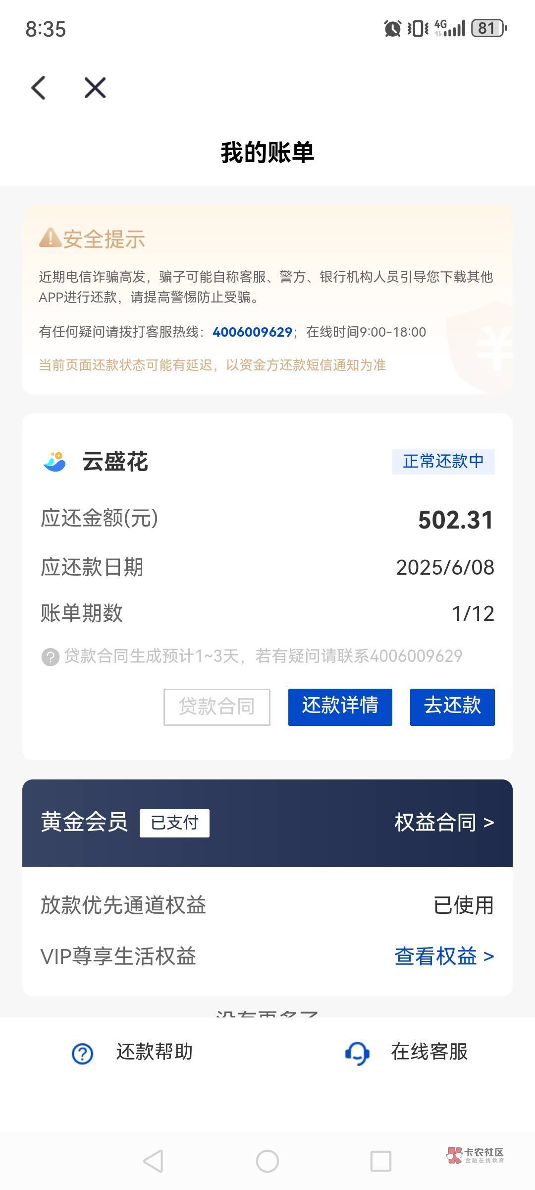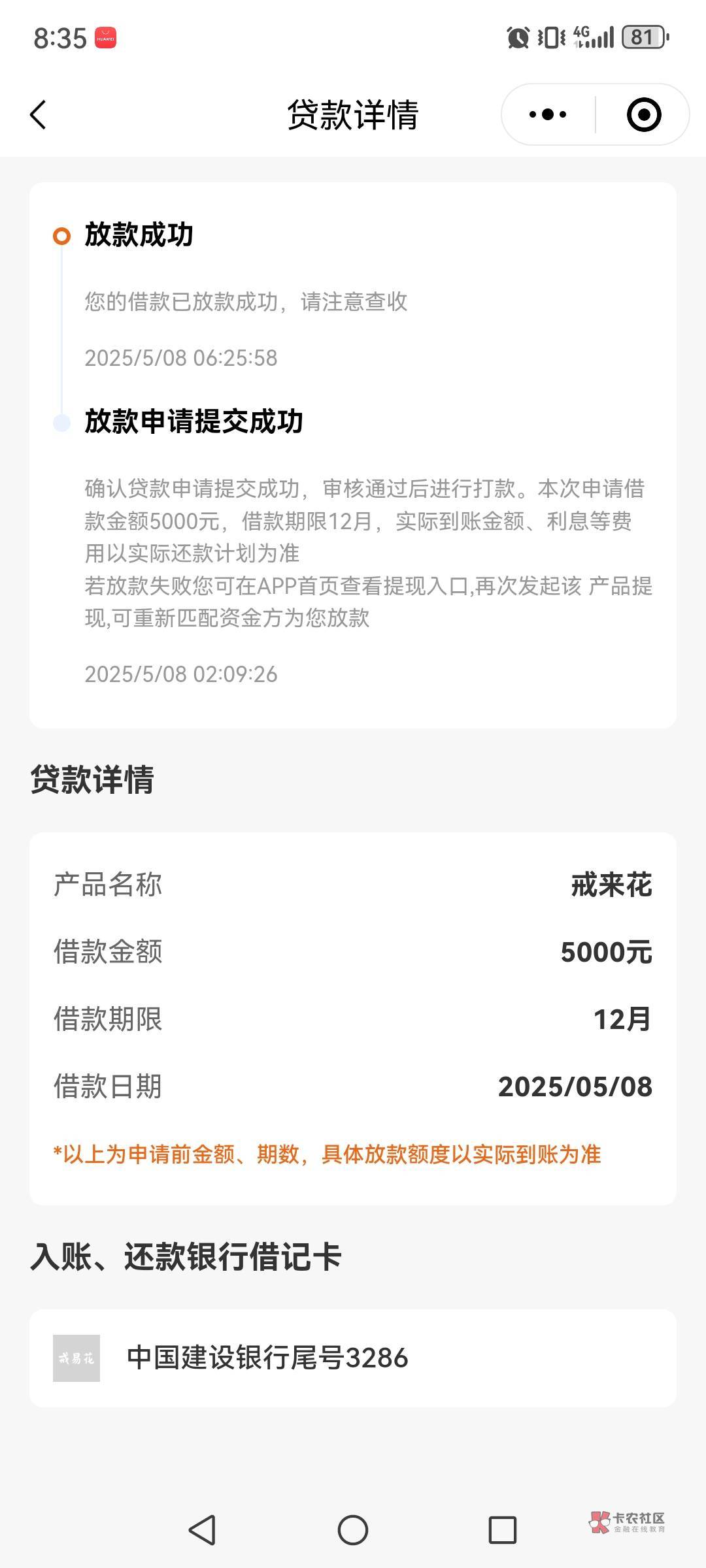 ,昨晚半夜二点多申请的,以为凉了睡觉算了,没想到阿,早上起来撒尿看看真的到的,但特么的,到底是云盛花还是戒易花,咋上面名字跟那个放款的就不一样了。故意从微信小程序搜一下,是戒来花。晕了。反正下款就可以,哈哈哈。但是被扣了会员700,今天找客服退一下。还有一个支付宝飞猪之前欠的三百多扣了,倒霉。但是下款纯纯意外之喜啊