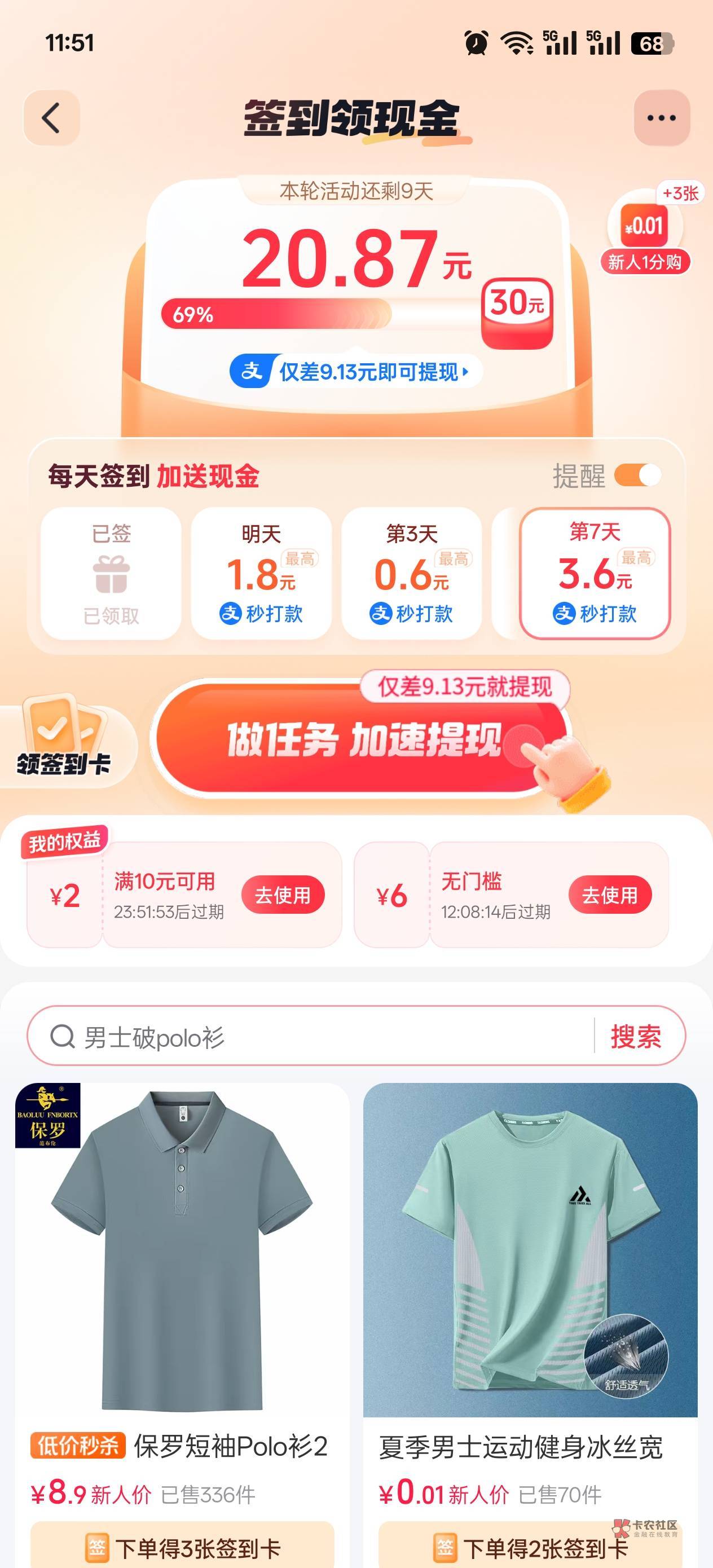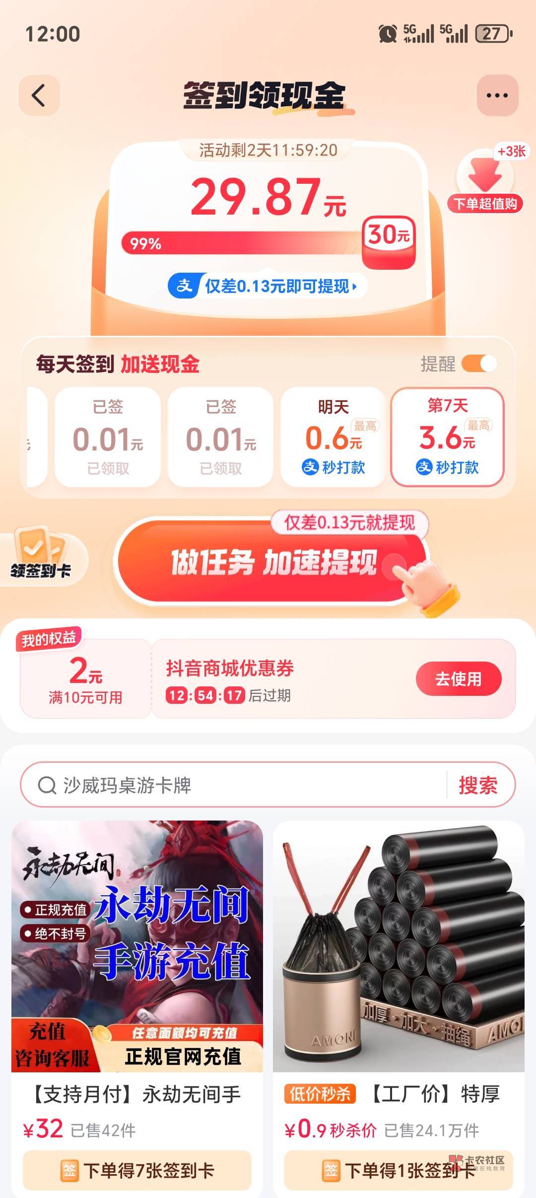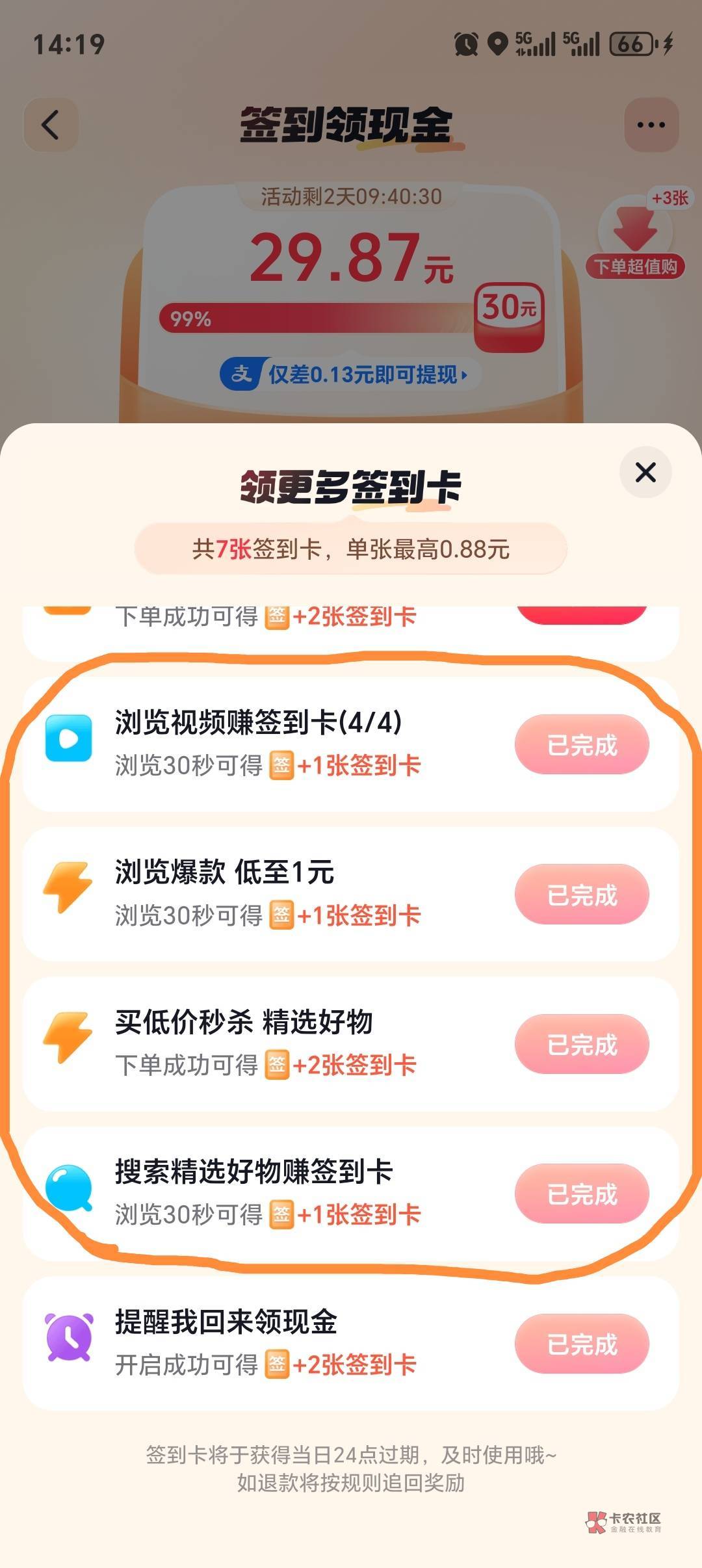 这个就不好说了,早两天你就该发帖问的,你现在连续两天把任务拉满,四个下单的任务都拉满,可能还行。我是一开始就每天下一单秒杀一分的,每天8次机会,轻松拿下。