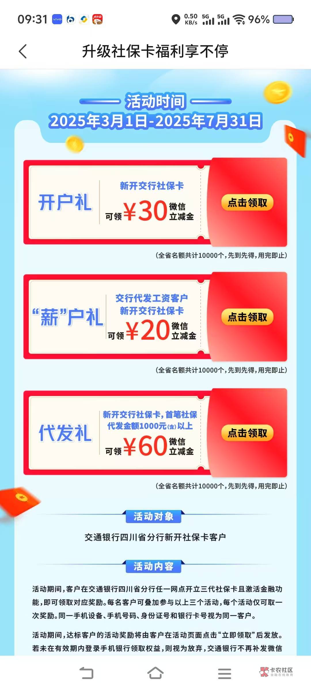 话术就说,我参加了四川分行的升级社保卡福利享不停活动,领了一张三十一张二十立减金都用不了,我前面向你们客服反馈了这个问题,你们客服补了三十贴金券,还有一个20的没到账,就这样说
