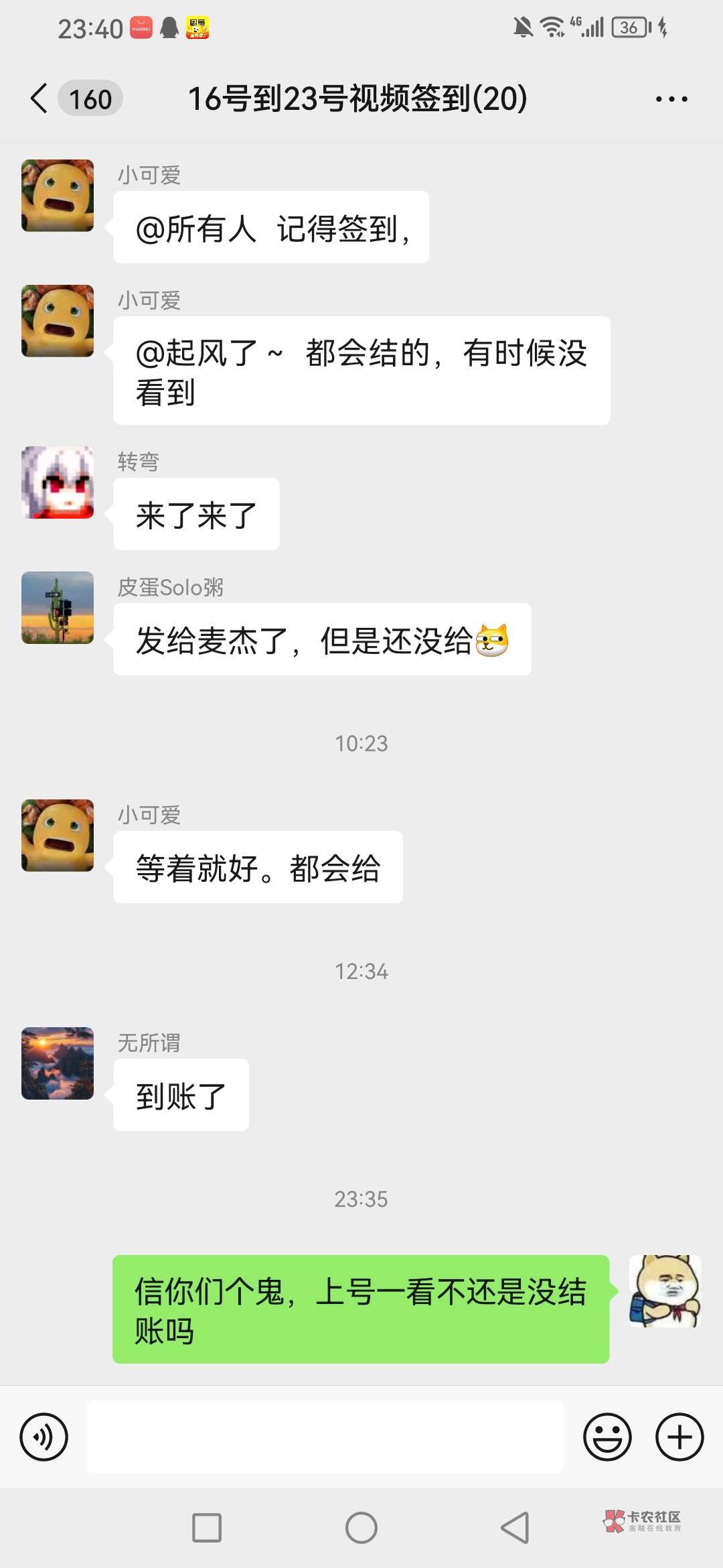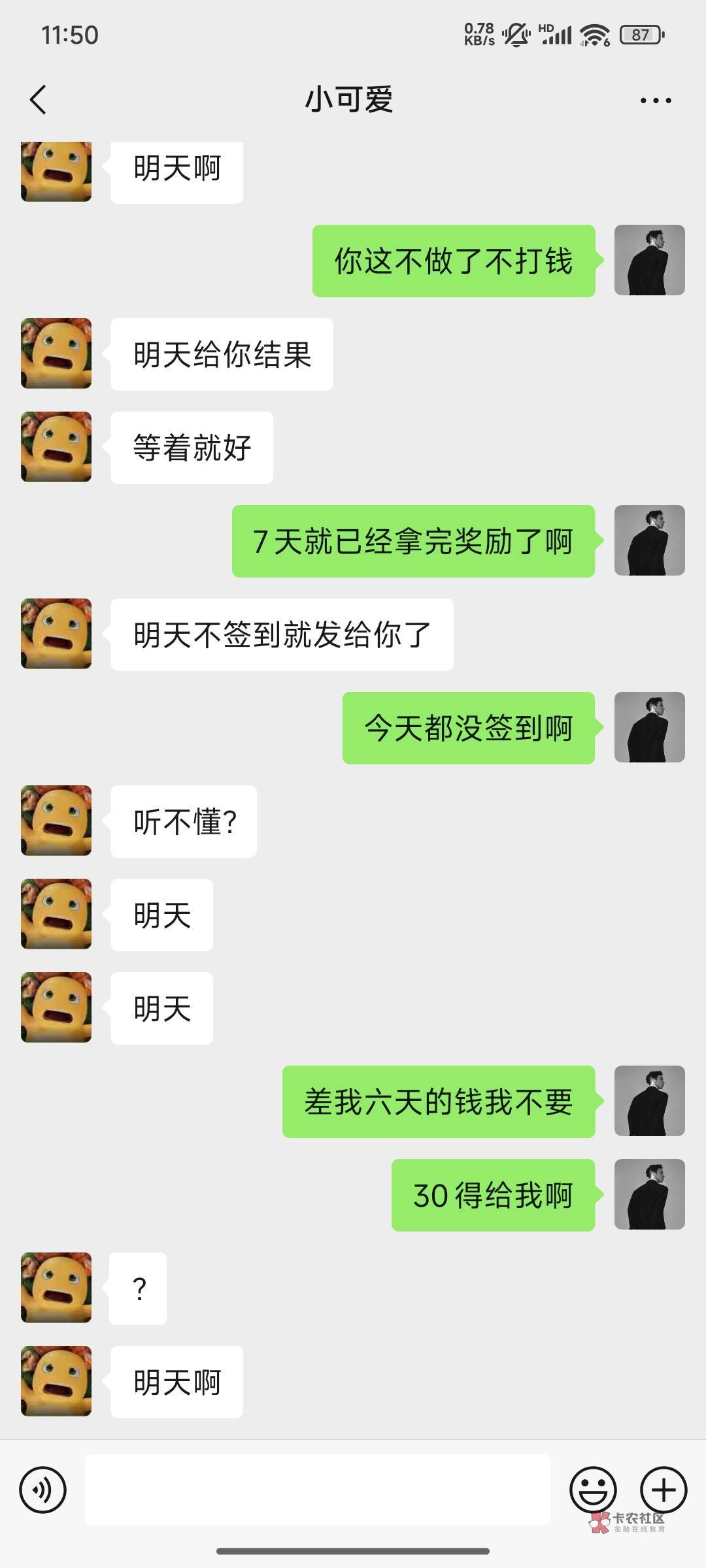刚发卡农回信息了结了前天的,昨天的还没结,今天第七天明天再说,先别签