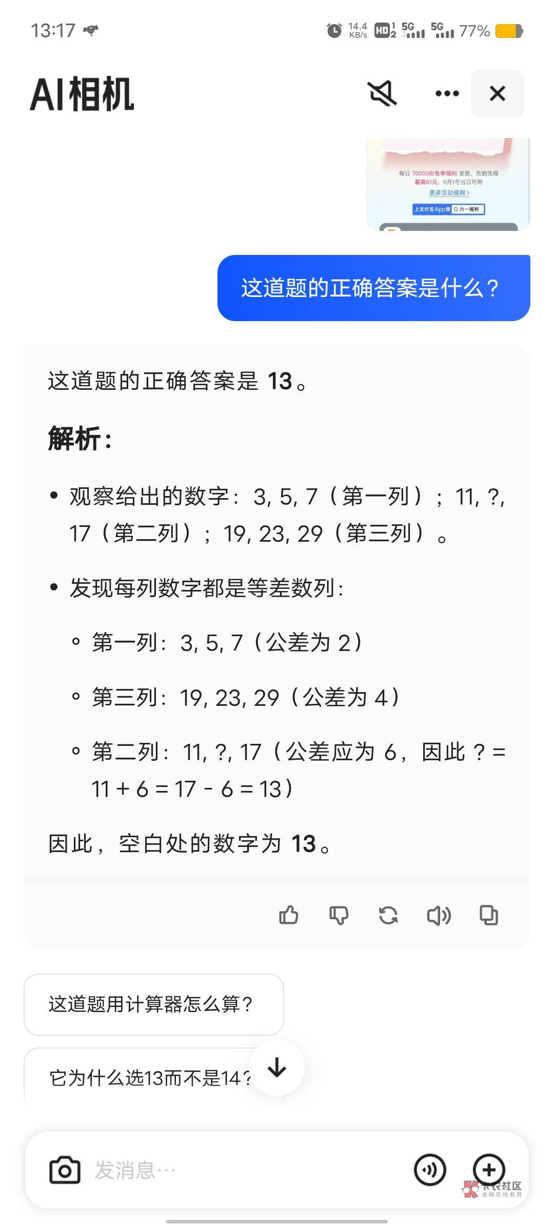 。第二列:11,?,17(公差应为6,因此?=11+6=17 - 6=13)