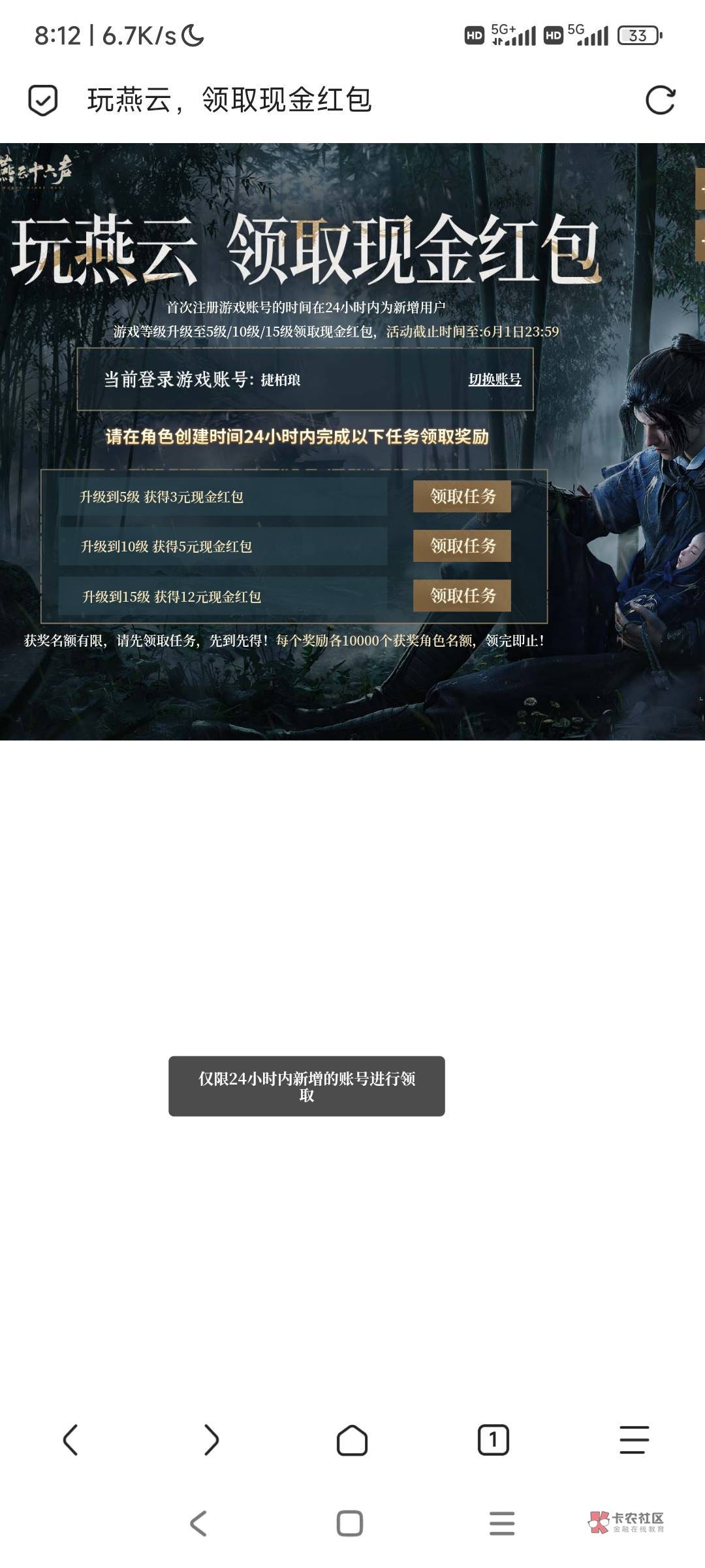 应该会修复,我玩了九个号,有一个和你一样,有一个就是手机玩的不给我领!只有七个有用!等修复了再出!但是这个没领到不想打了!还得充网费!