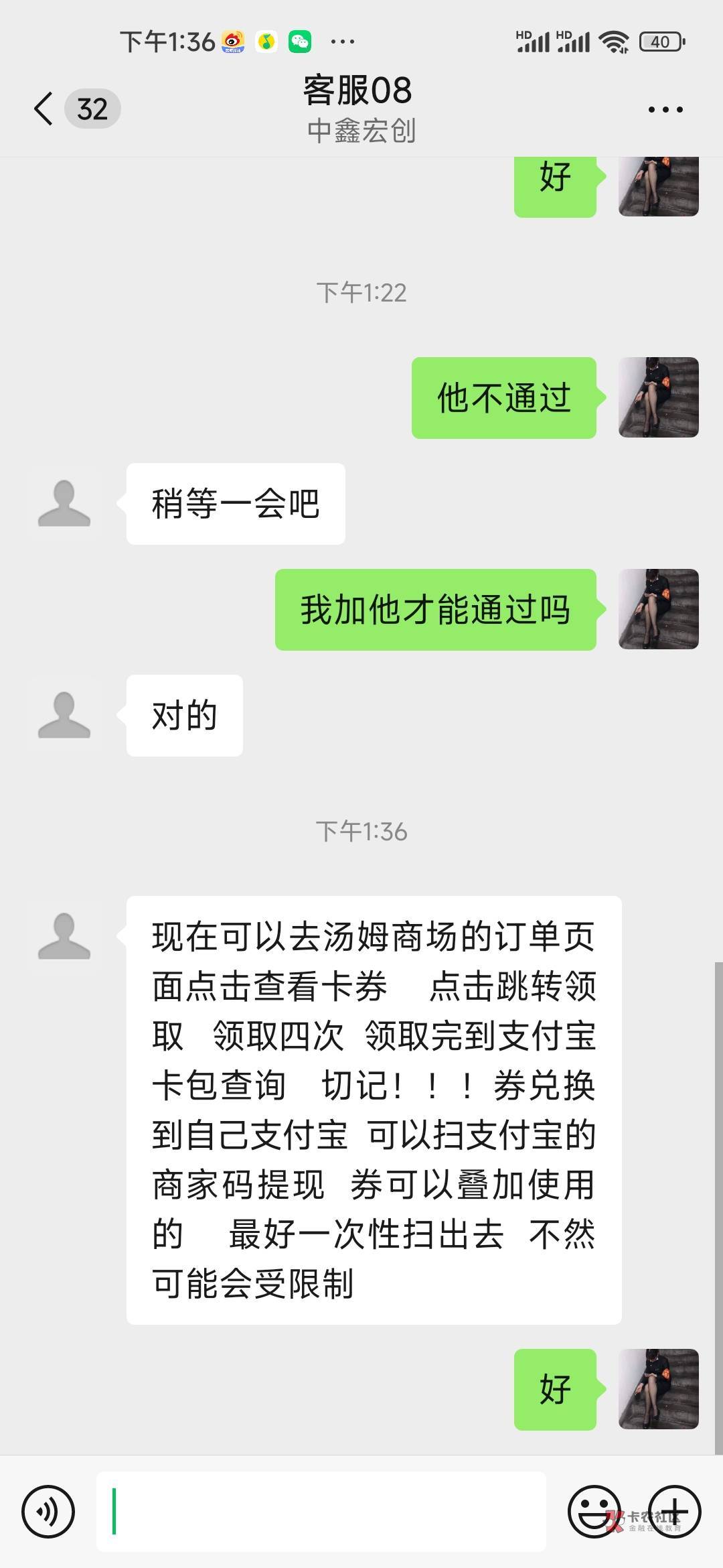 要不要我帮你回?我两个微信都加了。要名字跟手机,然后会叫你去平台那里签约就可以了。