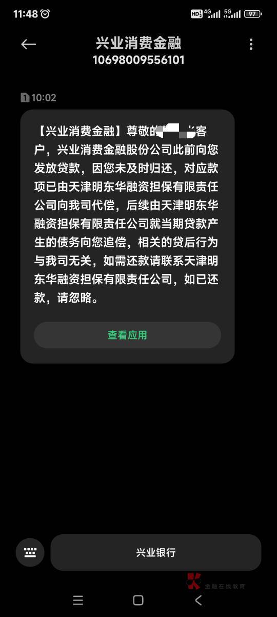 一共5000,还第九期,就500块钱,我贴里没说清楚,我这个是桔多多逾期两天,第三天早晨还上的,中午收到的代偿短信,给兴业银行打电话,说稍后反馈,给桔多多打电话,说已经还了还能收到短信可能是系统误发,我也不知道哪家说得准,过几天去查查征信