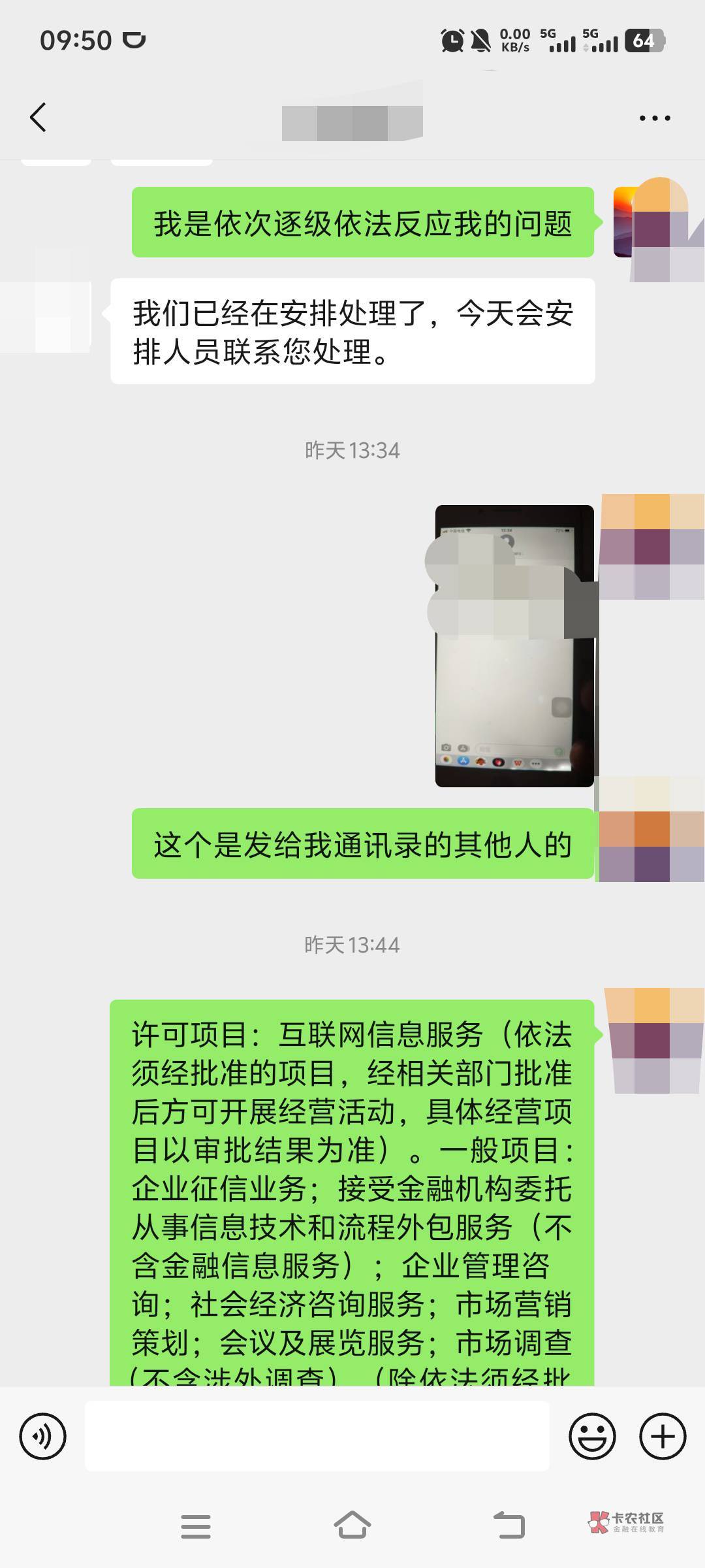 群发了信息,我还告诉他们可以给我打,一天随便打多少个,她们直接说按程序走,就给我通讯录和单位发信息,我就只能找叔叔了,昨晚谈好了赔偿