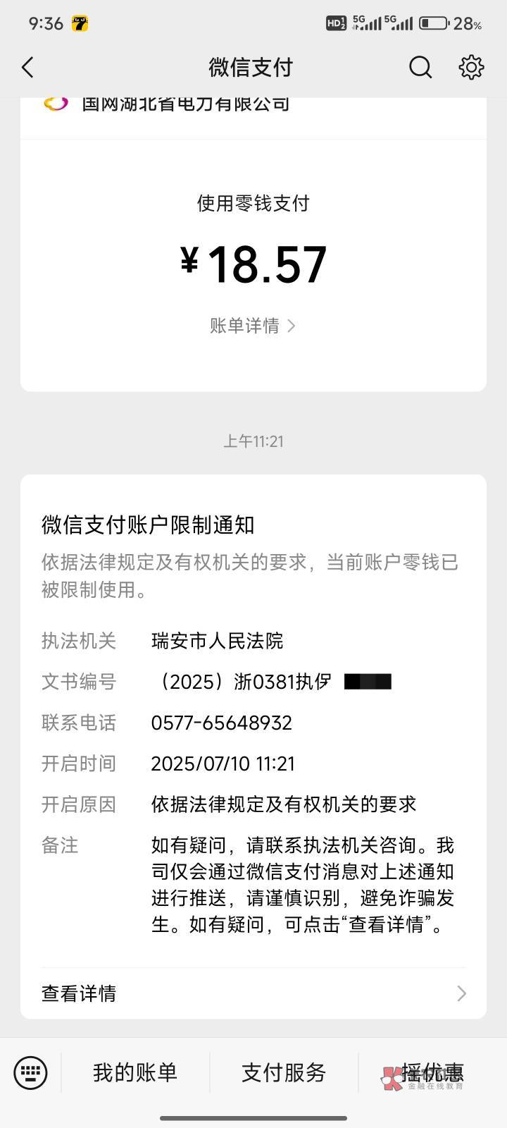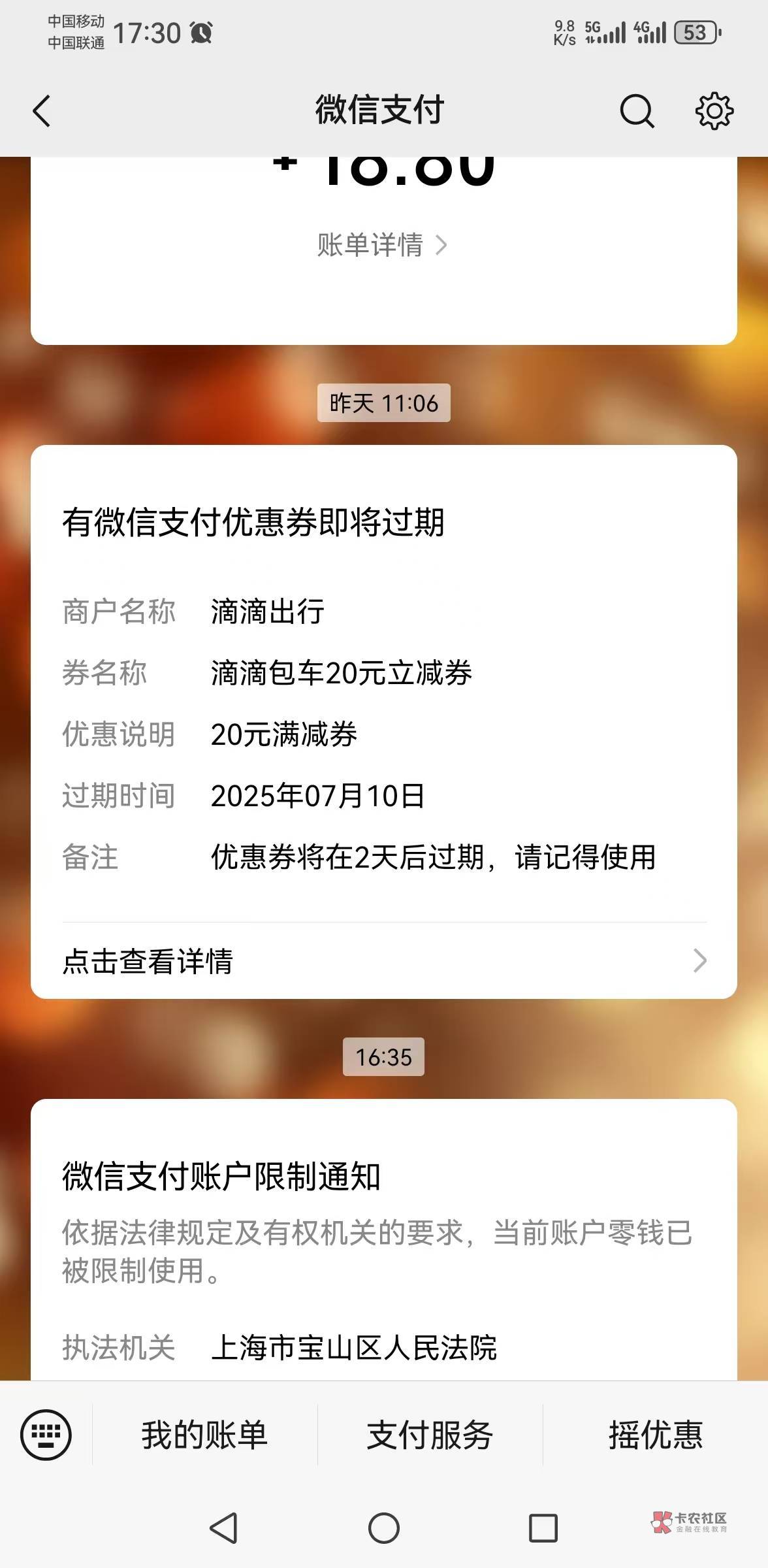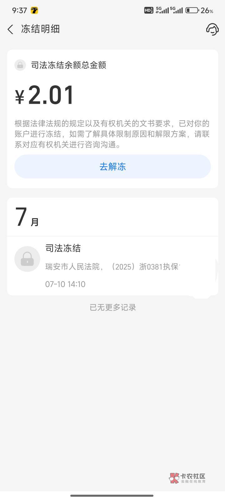 我5月执保,6月自动解开,冻结了1个月零7天。也是微信支付宝冻结,卡没事。