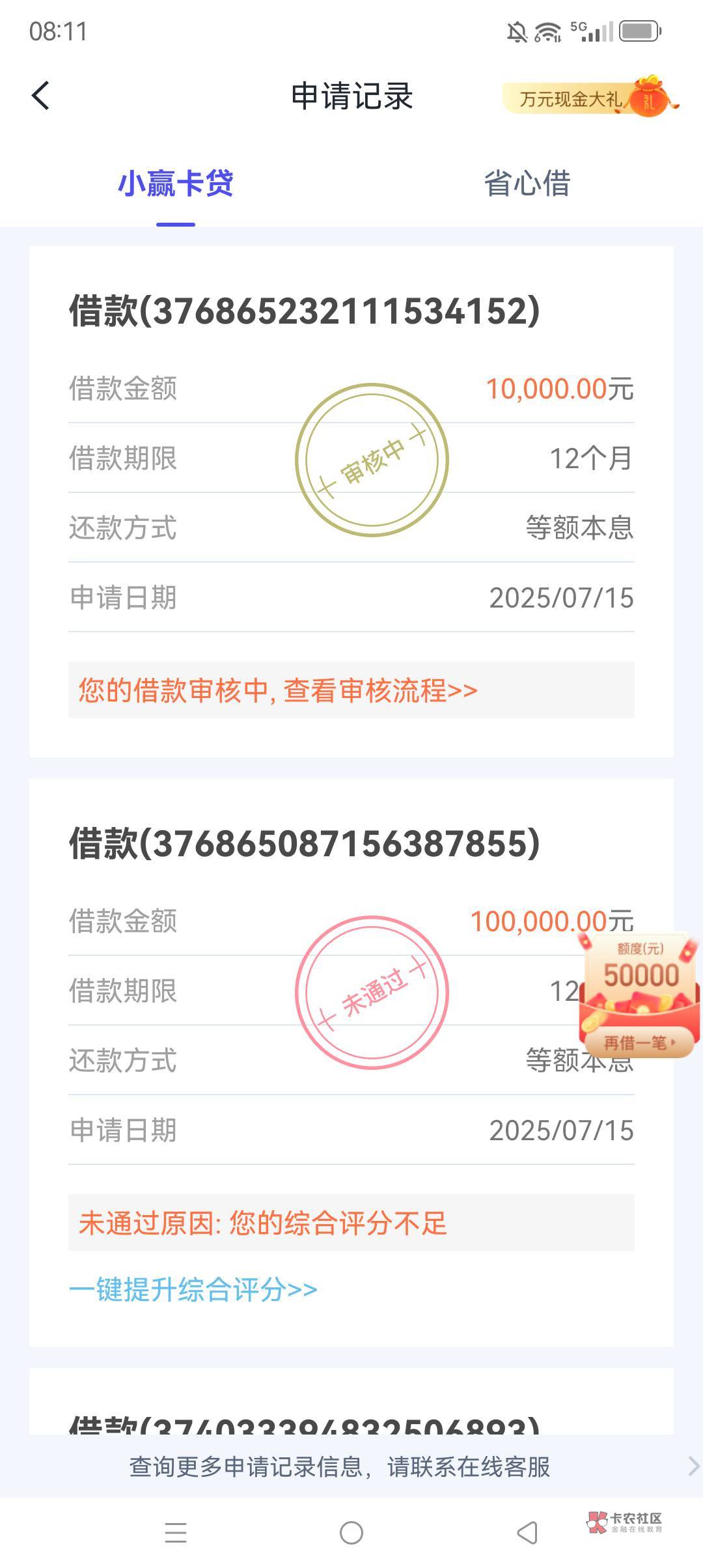 难说,第二笔每隔一周申请一次。我每次申请都审核六七个小时然后就是未通过看似有希望,实则拖延时间