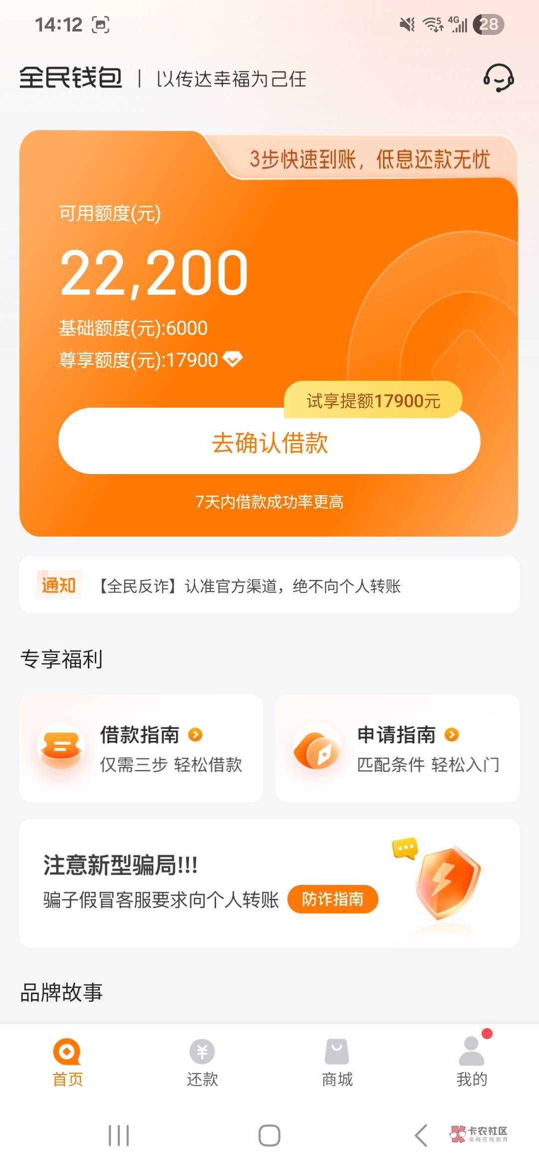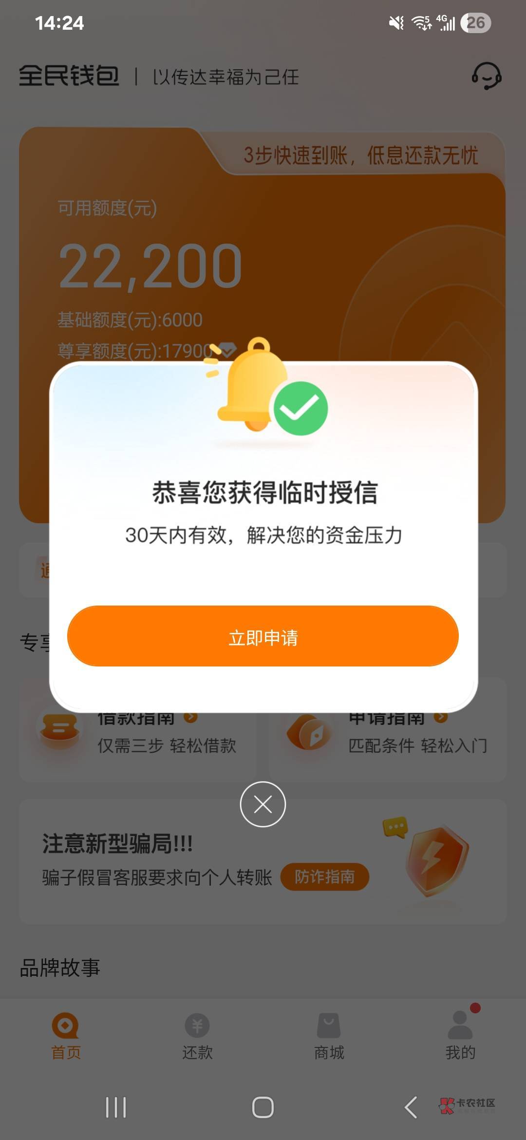 没有 被全民钱包cs搞心态了 说放额满了 重新申请只给了5000 还只能分三期 借个毛 不过是百分百下款