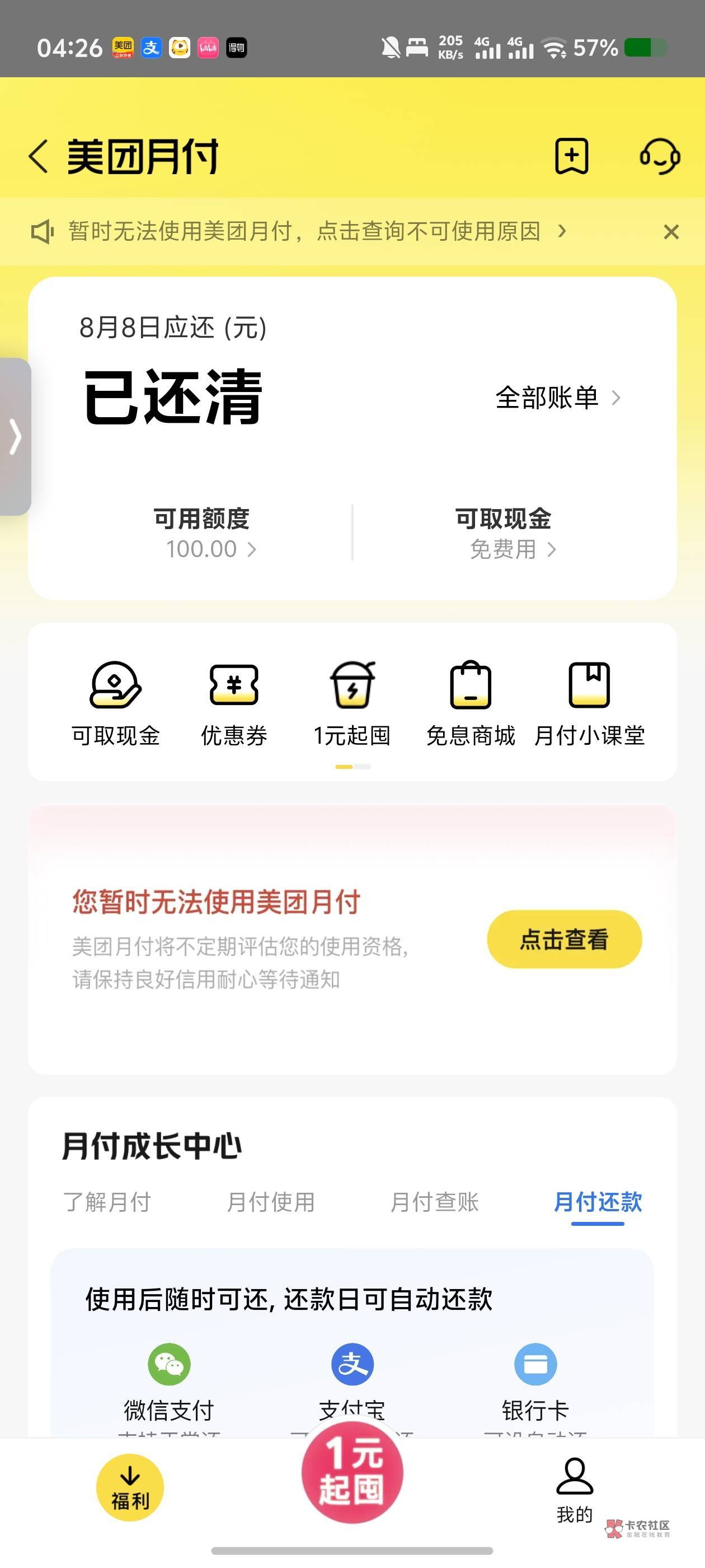 抖音月付不也一样 用了几次 不给用了买东西还限制50 以内一次。