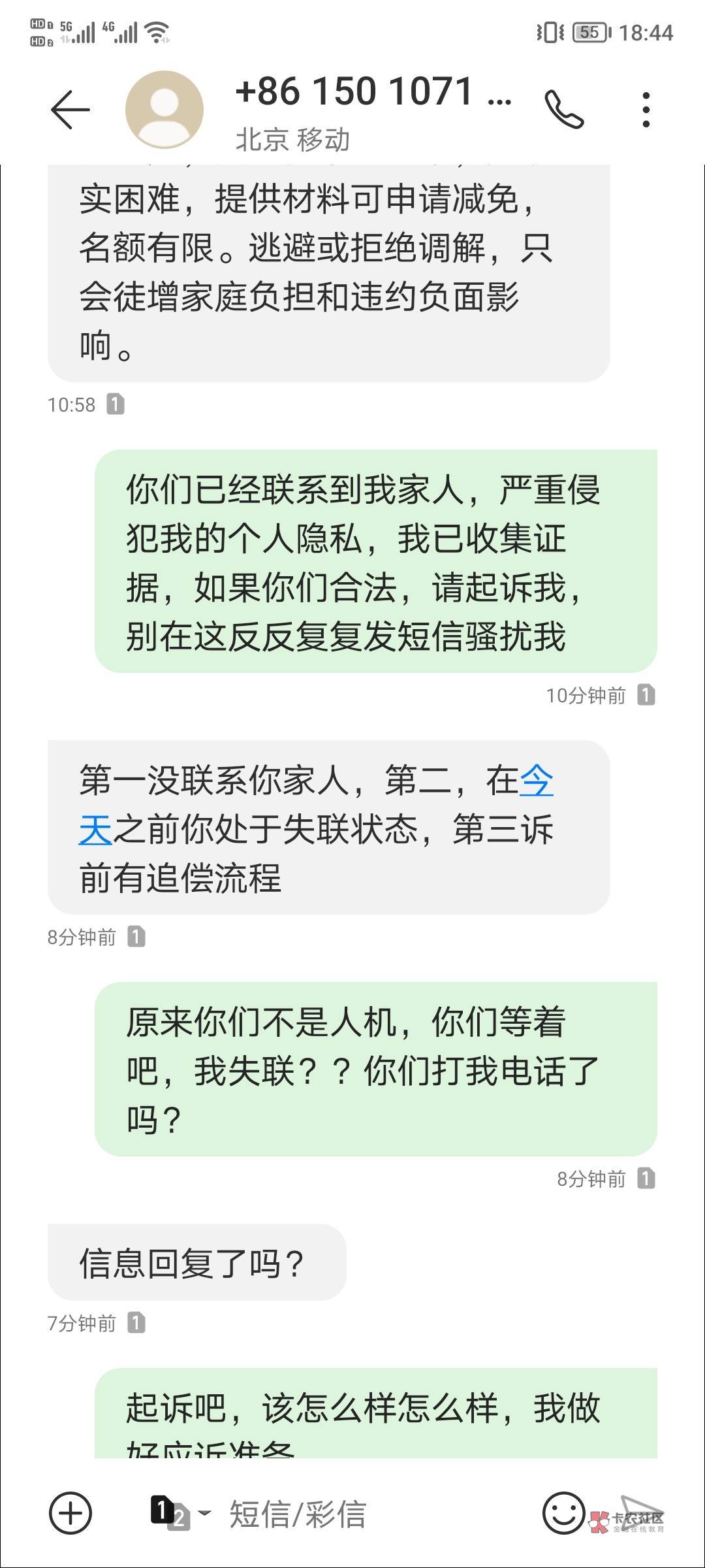楼主,我最近也是收到私人垫短信,最开始是要给我发律师函,然后是协商还本,要冻结我卡,今天发的信息是给我邮寄函件啥的,都是四川北京的号码,楼主你这边是哪里发的短信