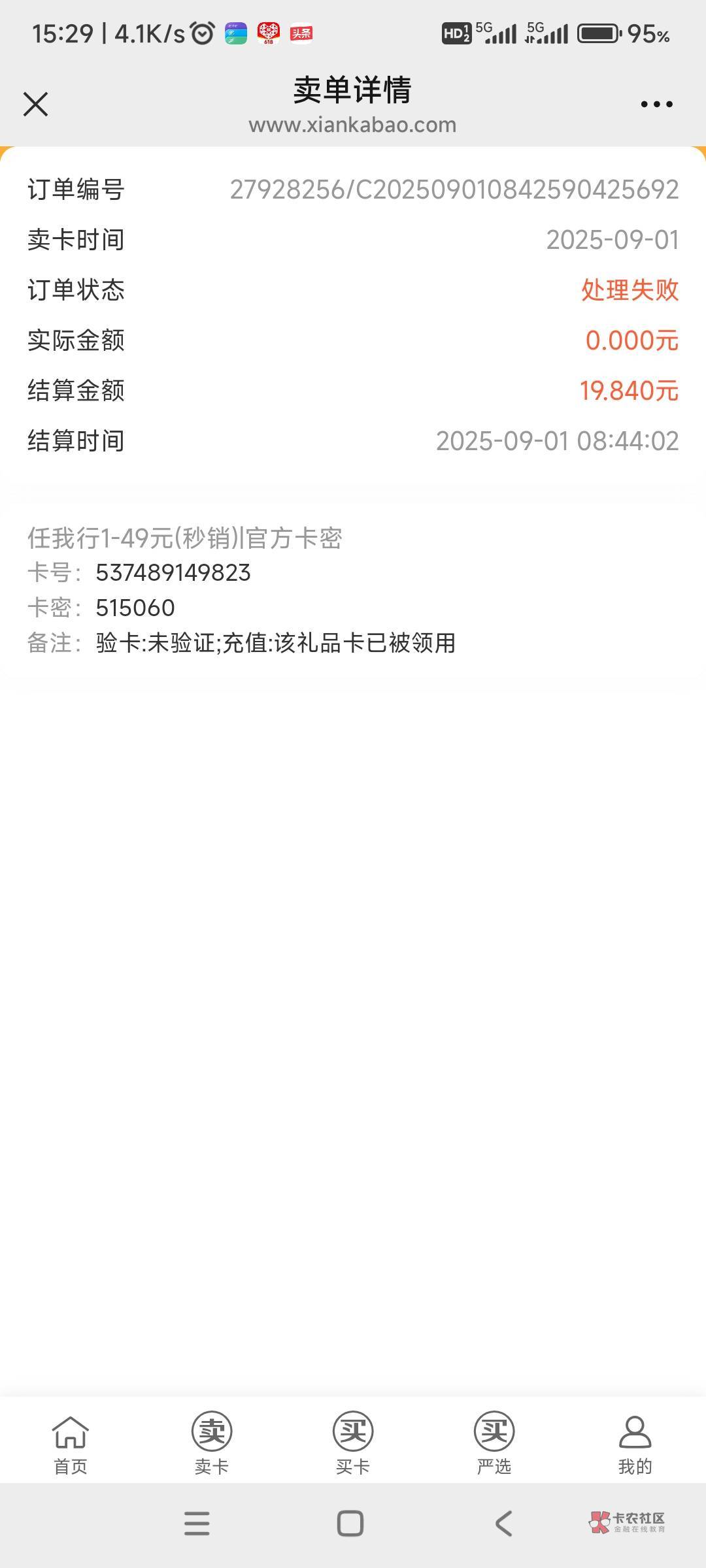联系闲卡宝客服,有时候他出了失败,联系客服了,他会补给你的,上个月很多老哥都是这样,