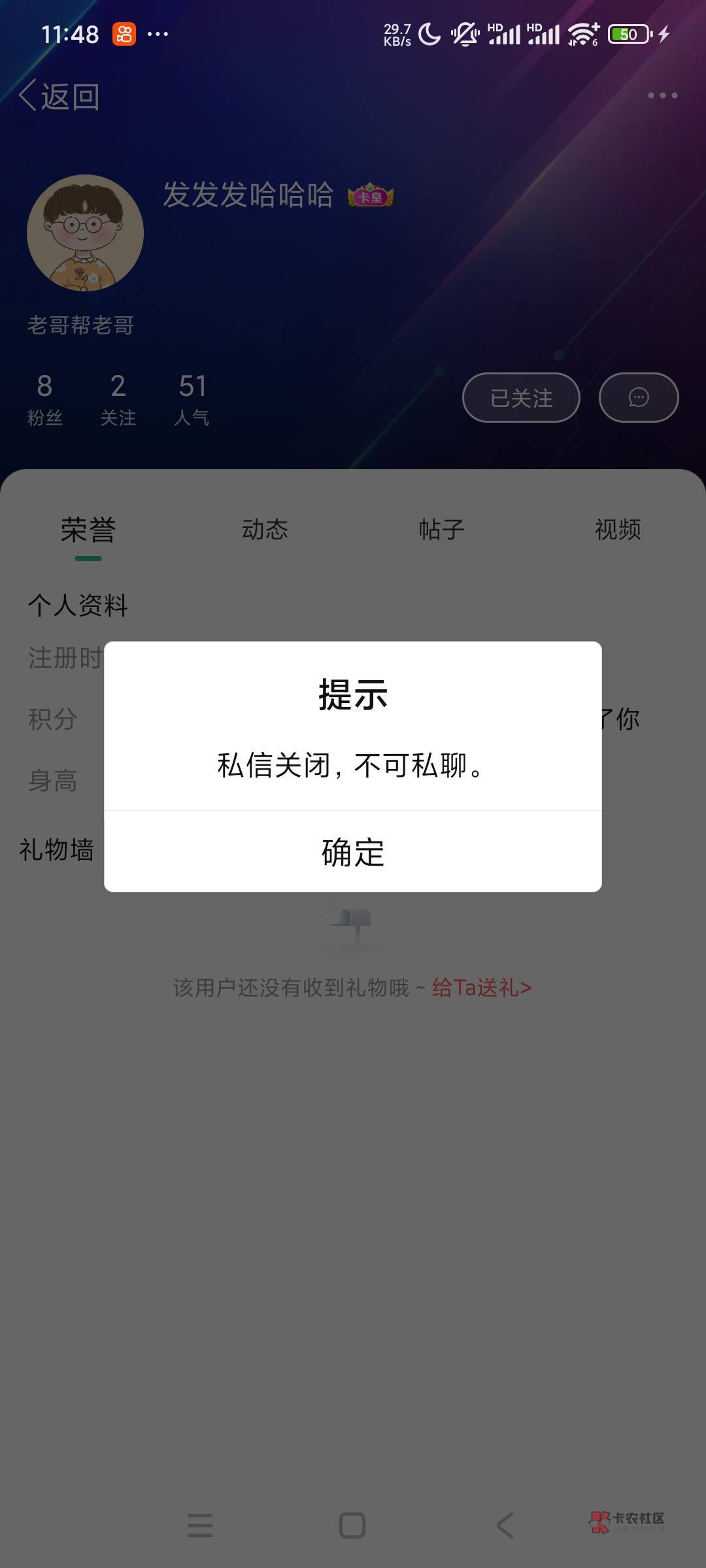 问了一下卡农客服,说无法私信。私信都是关闭的。帮不了你了。老铁