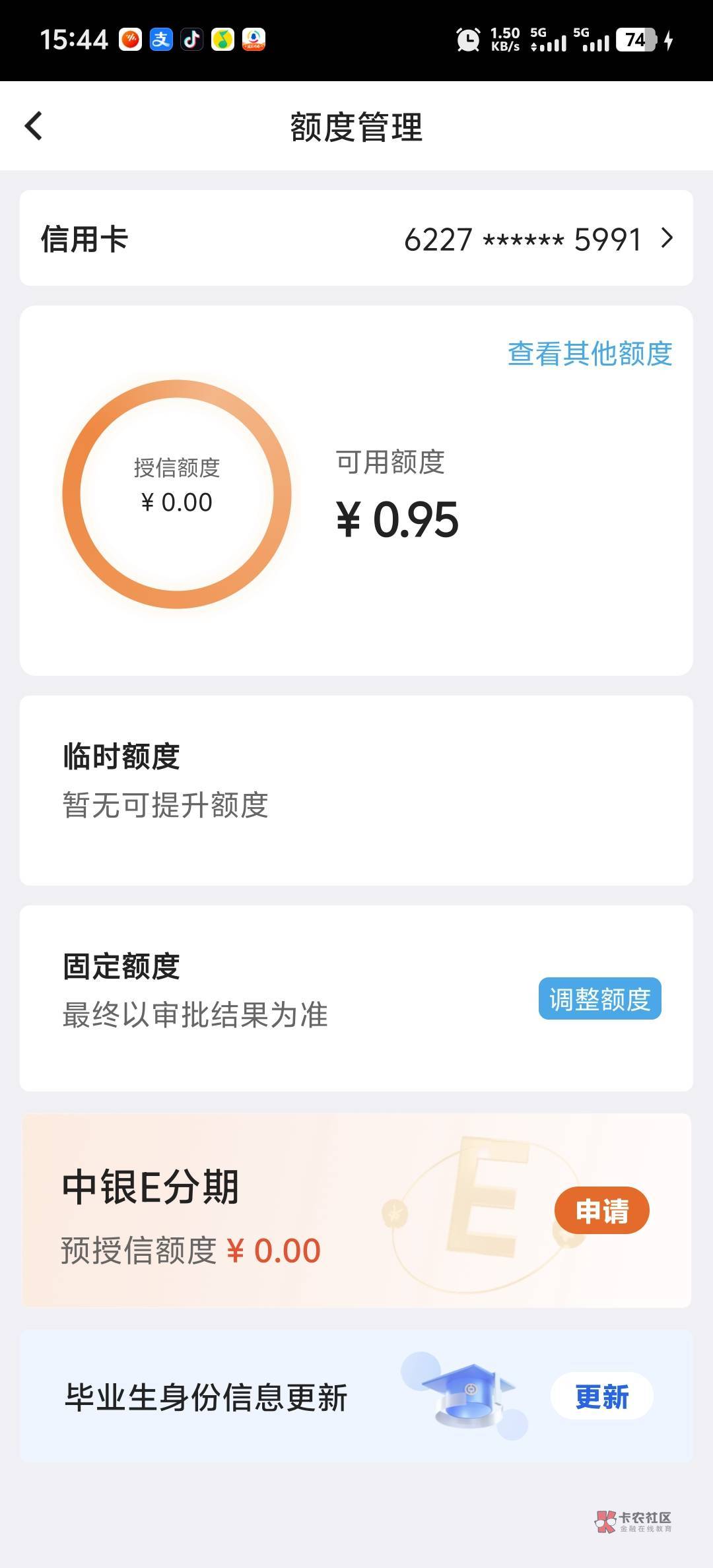 学生卡要更新毕业信息才行,而且学生卡的额度毕业后也可能一般?