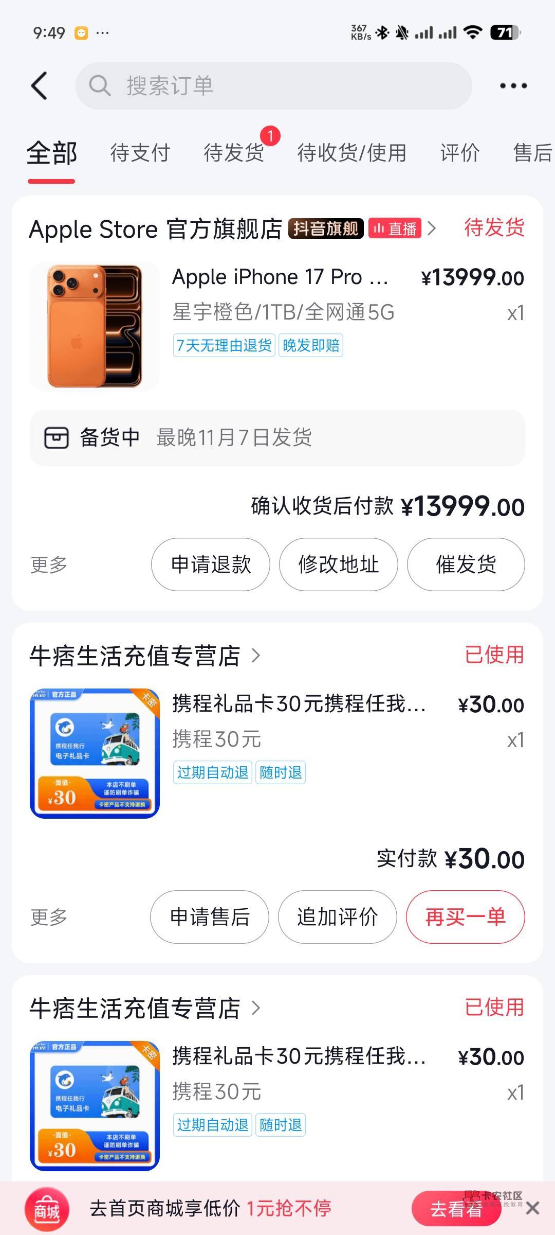 我也卡成功了 但是我看最晚11.7发货